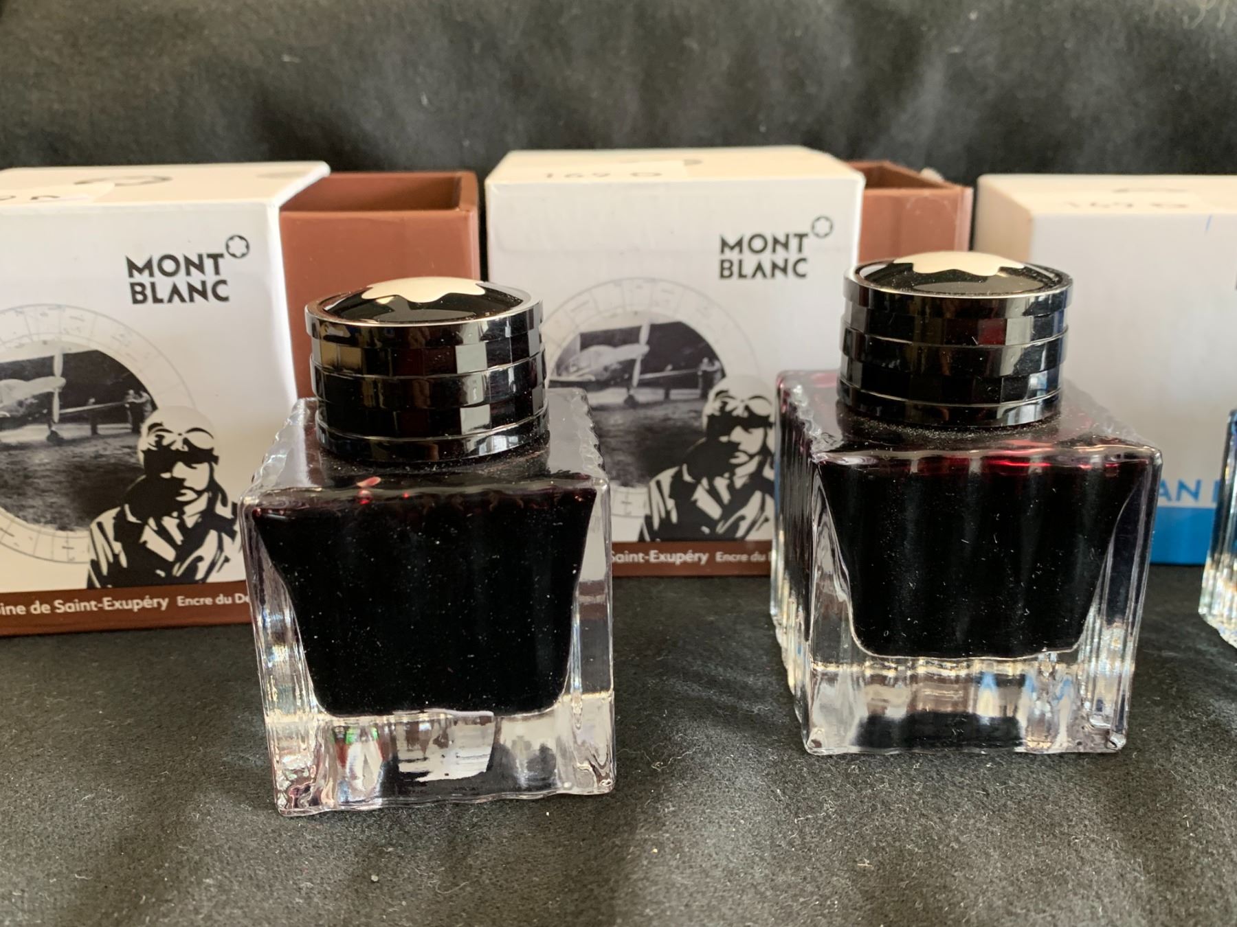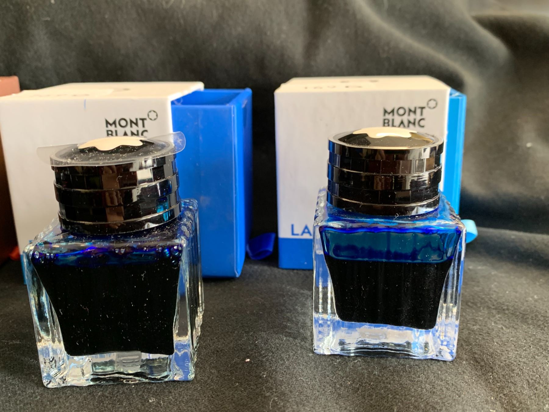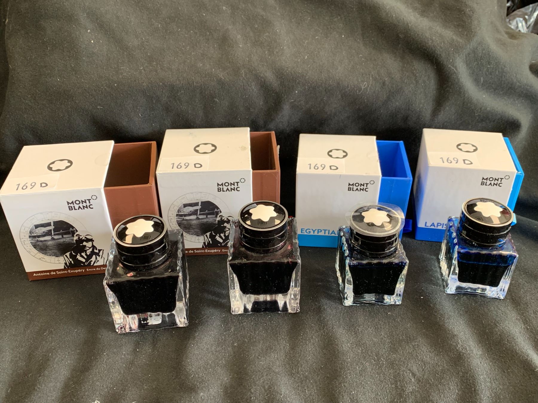4 BOTTLES OF MONT BLANC INK, BLACK, EGYPTIAN BLUE, & LAPIS LAZULI BLUE