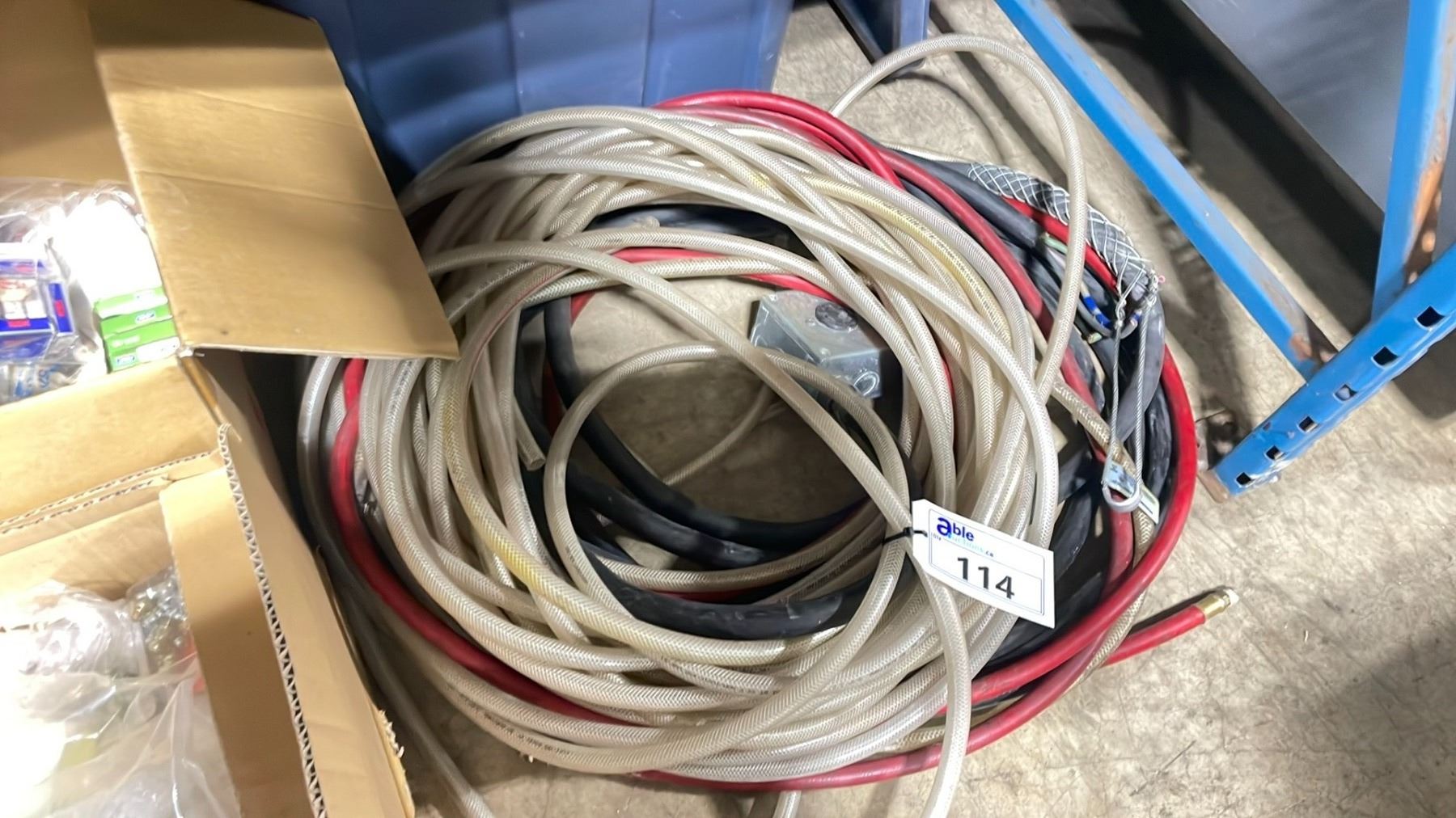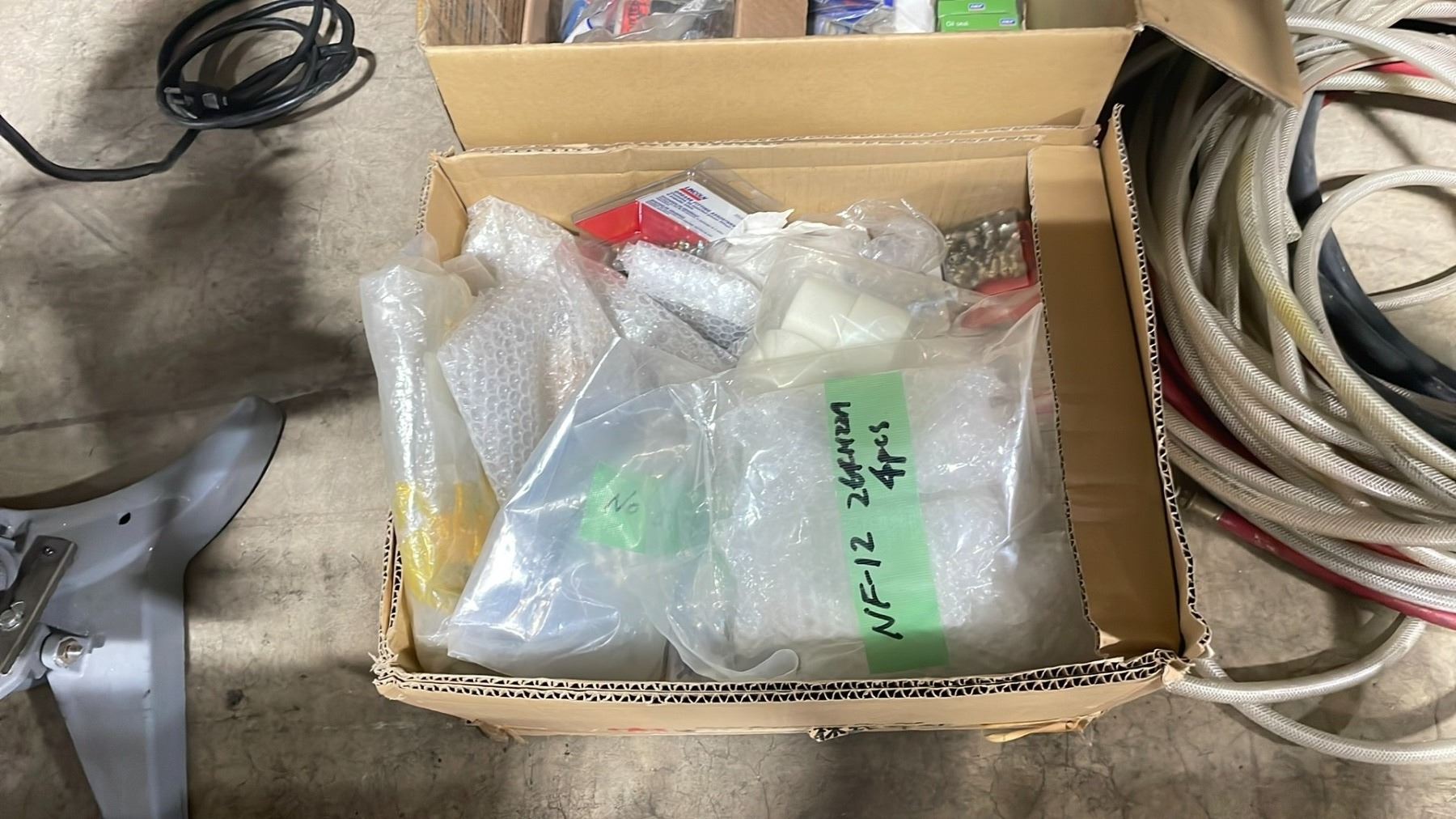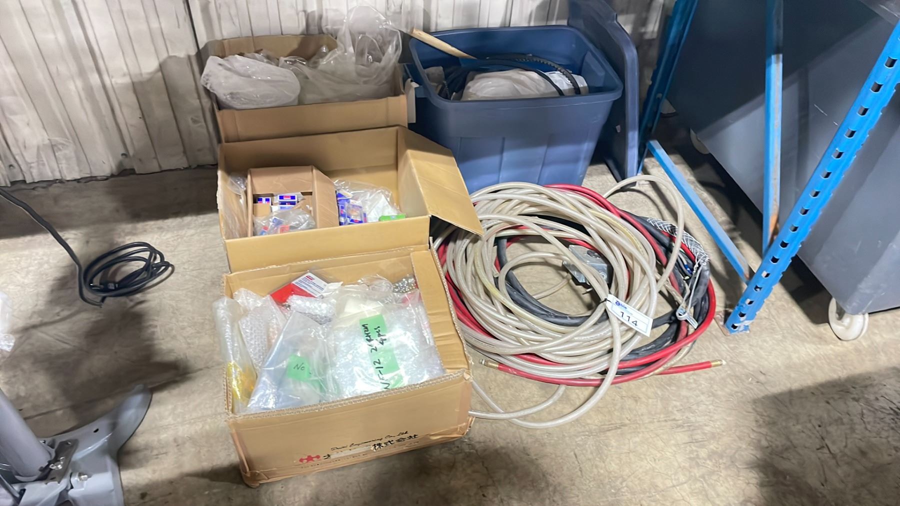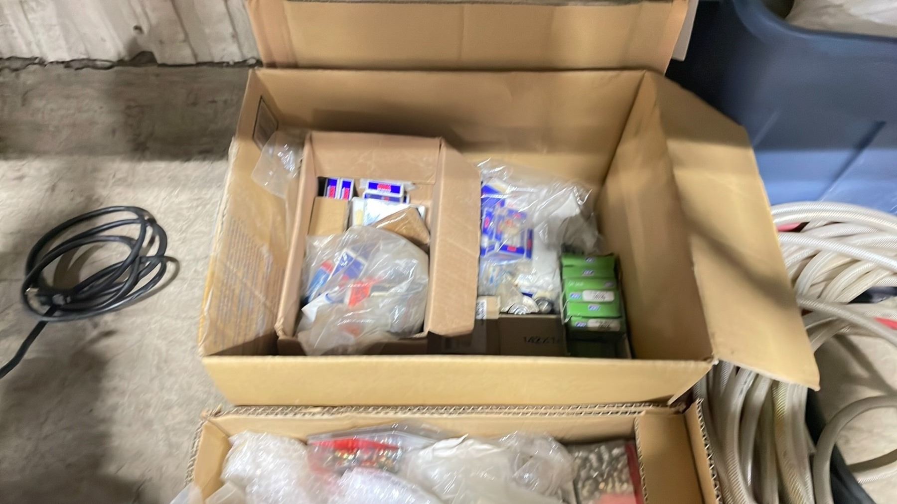 4 BOXES OF ASSORTED HARDWARE, TOOLS, HOSES, ELECTRICAL CABLE, & MACHINE REPAIR ITEMS