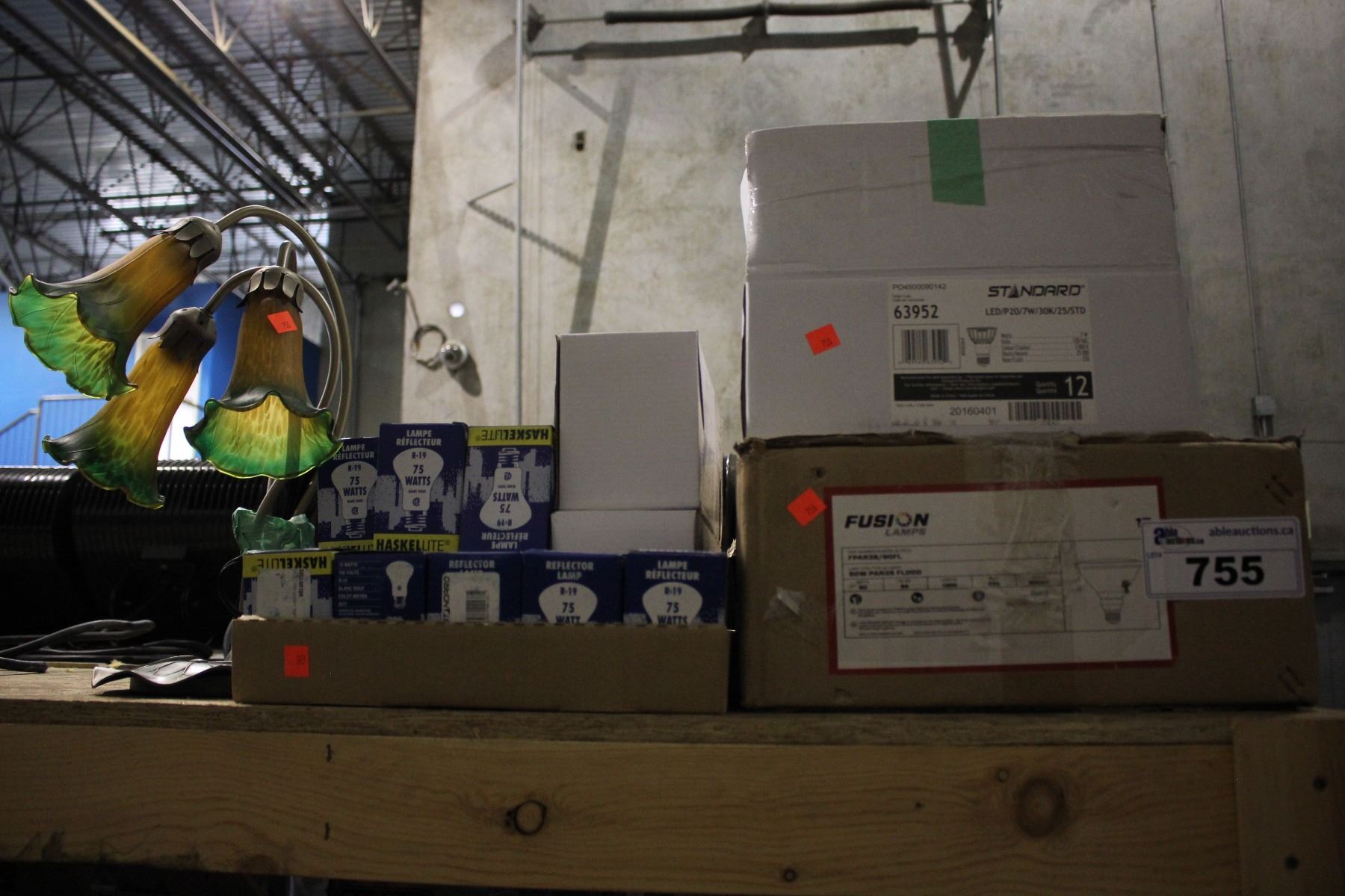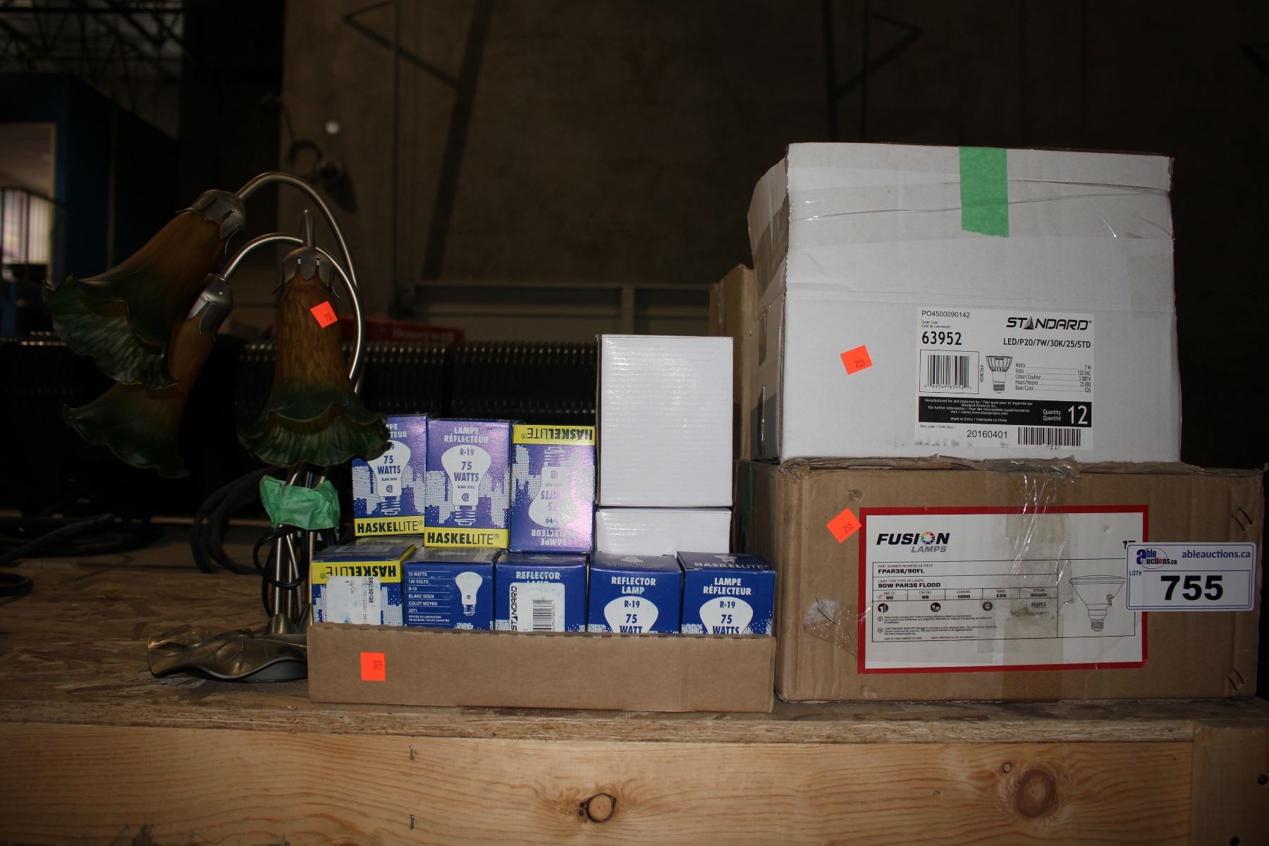 4 BOXES OF ASSORTED LIGHT BULBS AND STAINED GLASS TABLE LAMP