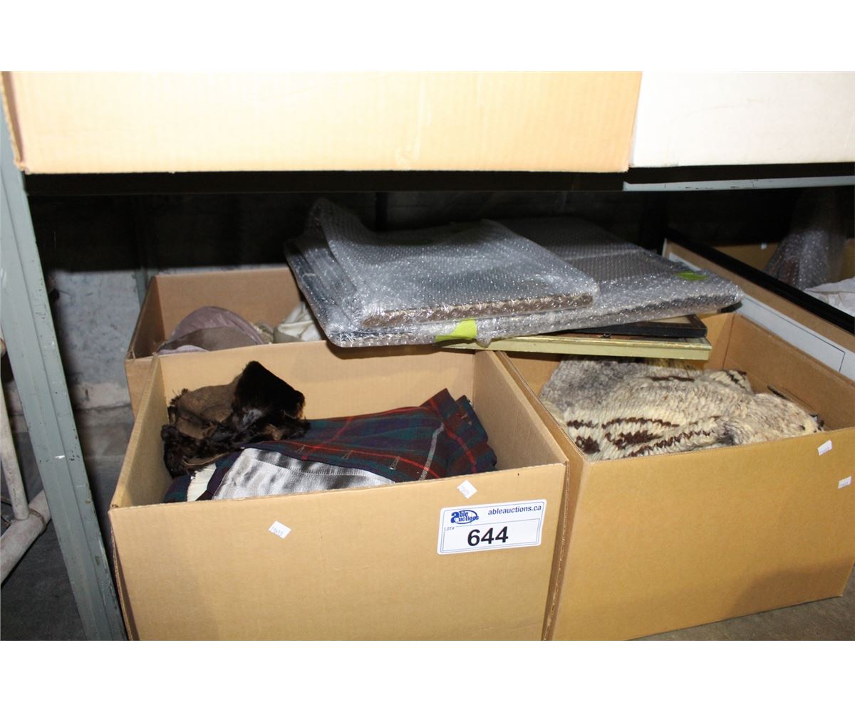 4 BOXES OF ASSORTED VINTAGE ITEMS; CLOTHING, PICTURE FRAMES, ETC