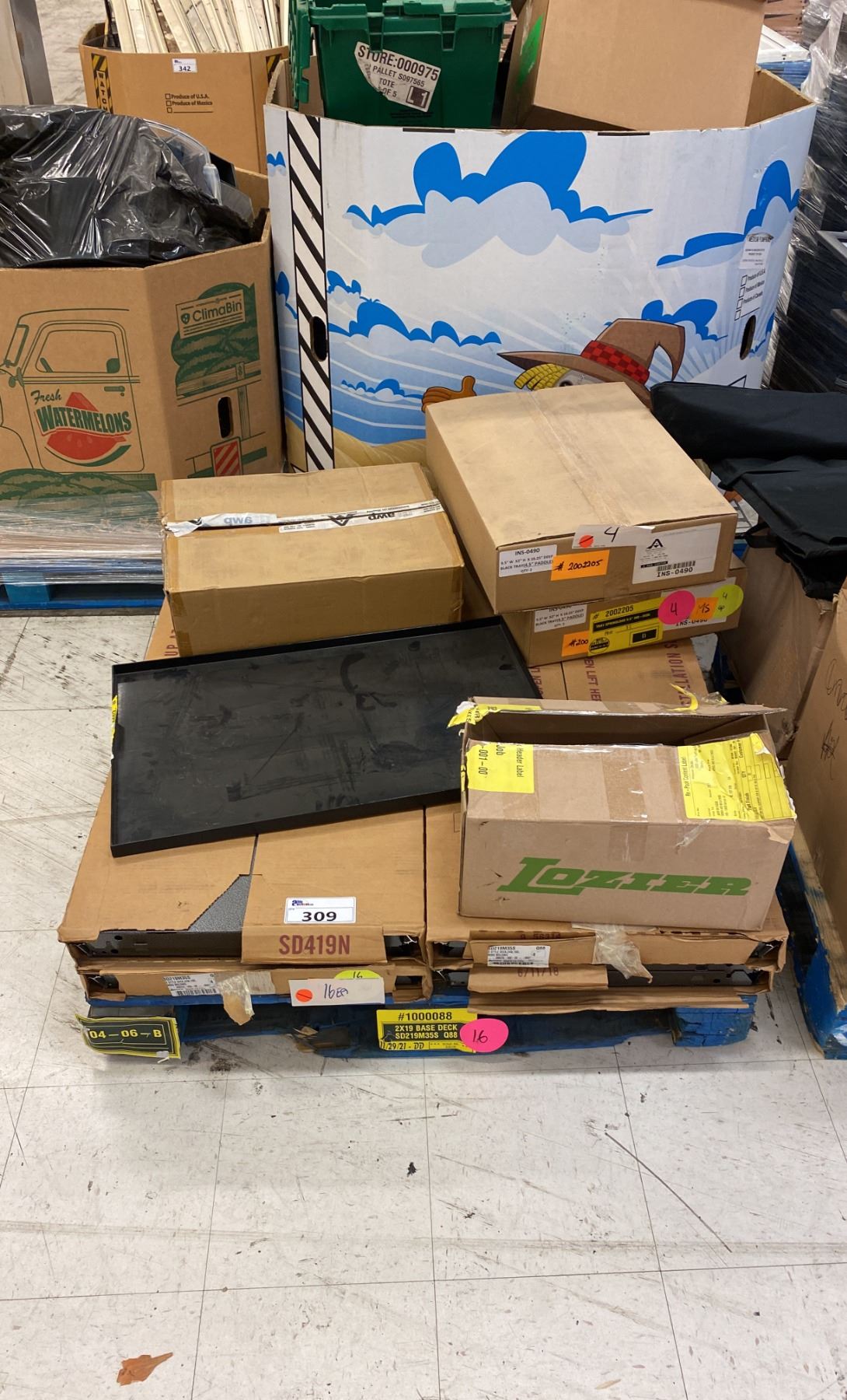 4 BOXES OF METAL COMMERCIAL SHELVING, 3 BOXES OF BLACK PLASTIC TRAYS & A BOX OF BOTTOM SUPPORT RAILS