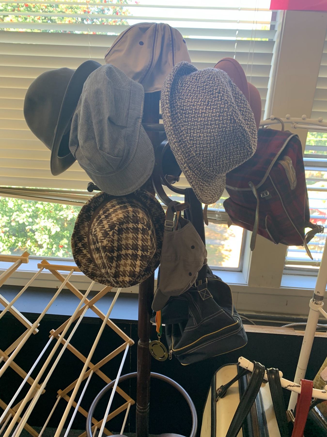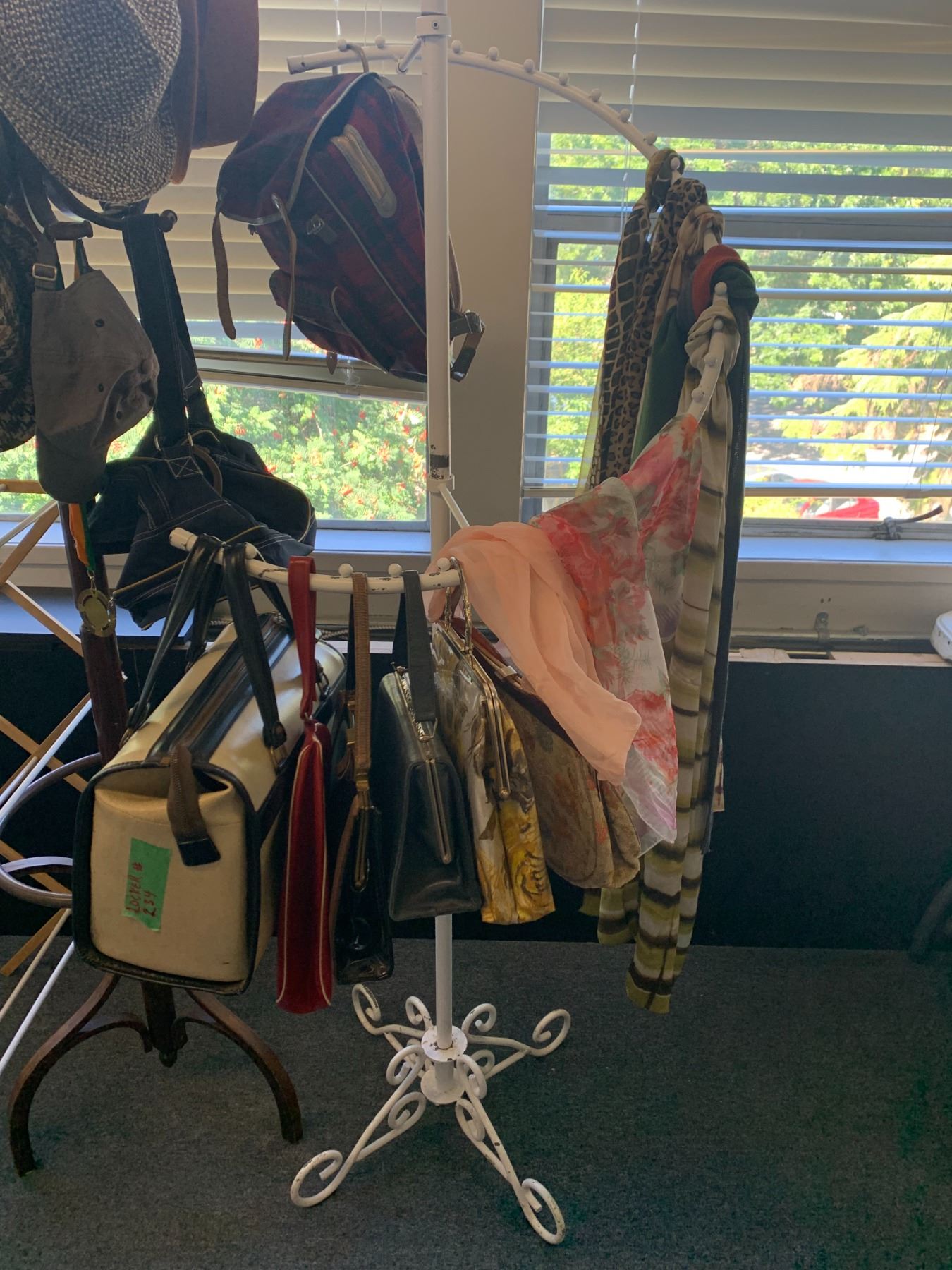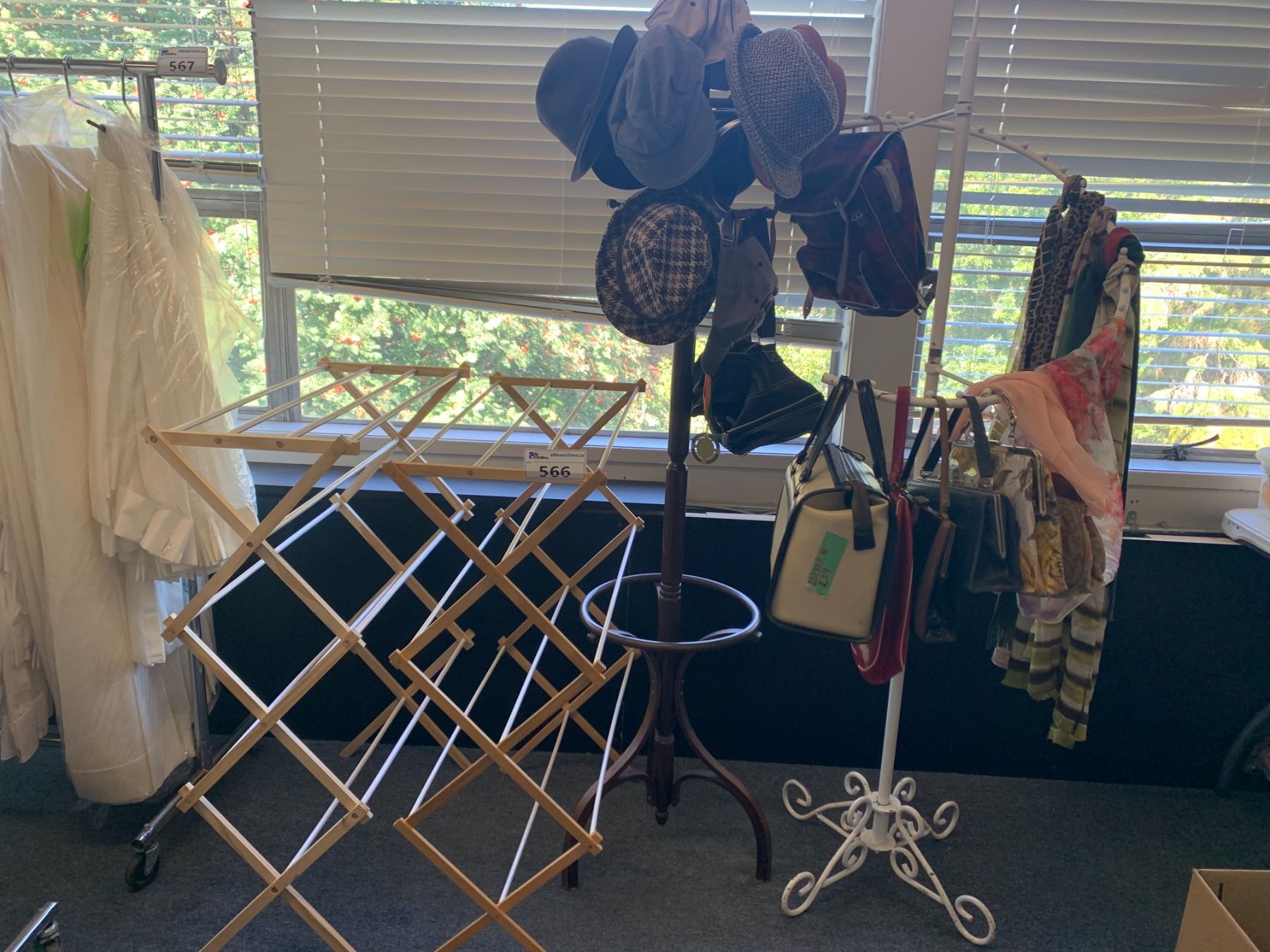 4 CLOTHING RACKS WITH ASSORTED HATS, SCARVES & BAGS