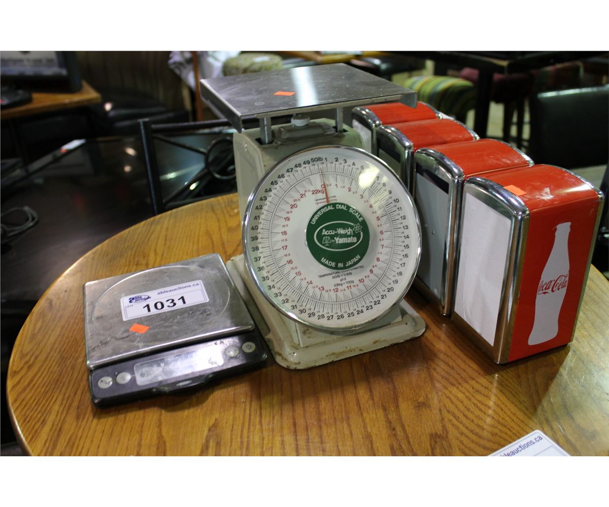 4 COCA-COLA NAPKIN DISPENSERS, DIGITAL PORTION SCALE AND UNIVERSAL DIAL SCALE