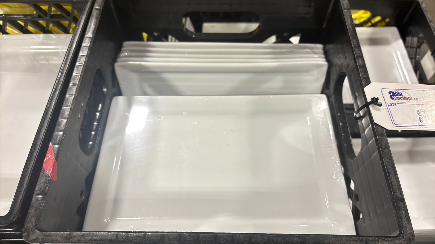4 CRATES OF WHITE 12" COMMERCIAL RESTAURANT RECTANGULAR PLATES *CRATES INCLUDED* ( APPROX. 20 PLATES PER CRATE, 80 PLATES TOTAL )