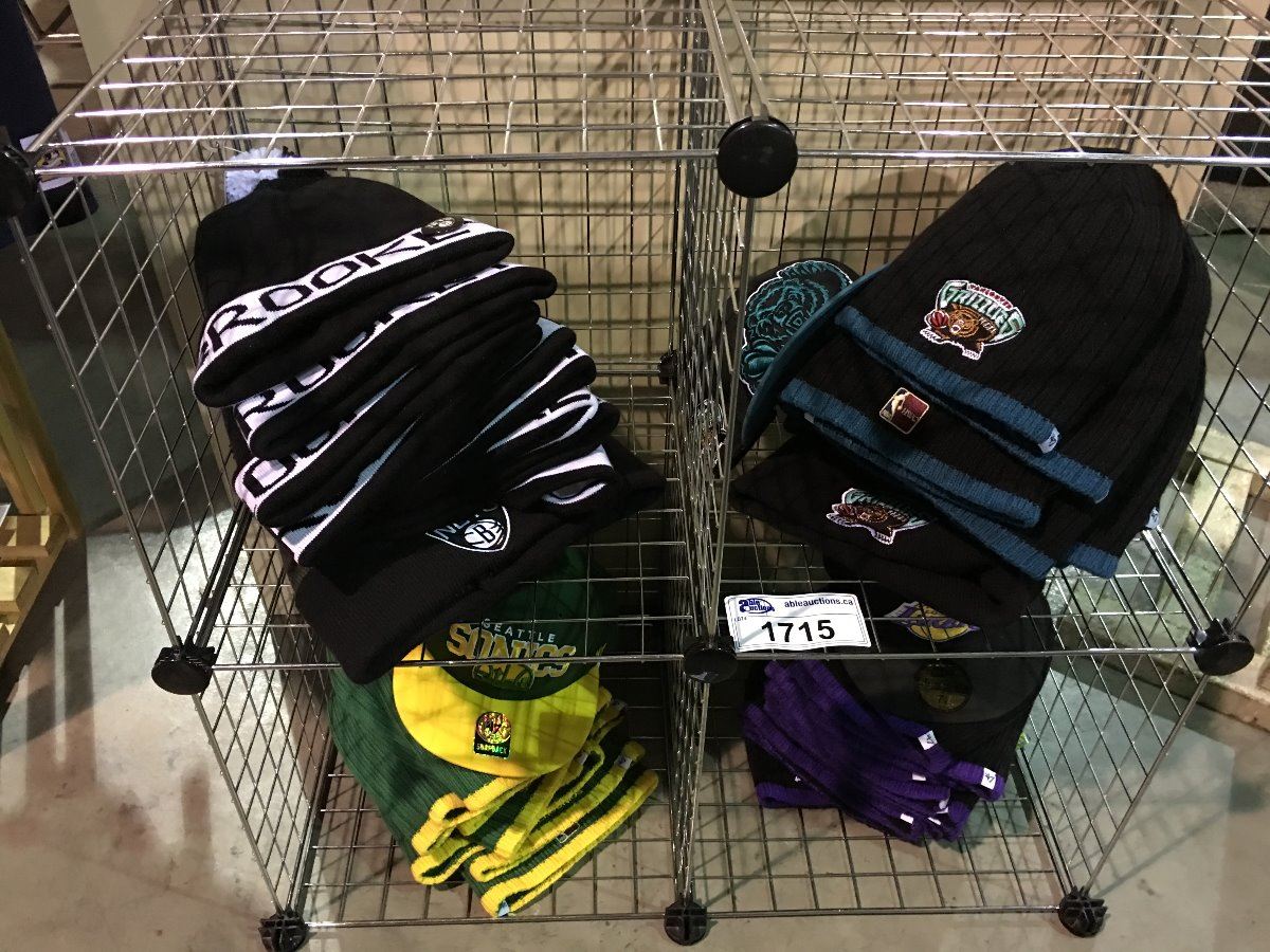 4 CUBBY SHELF UNIT FILLED WITH MBA TOQUES & GRIZZLIES SONICS NETS & 3 BALL CAPS SHELF INCLUDED