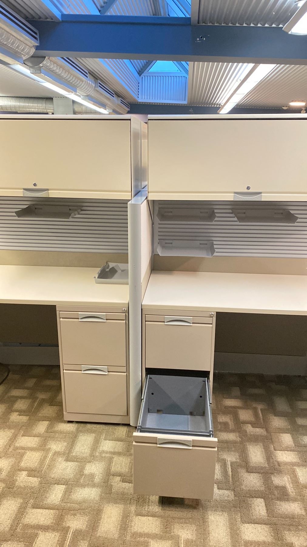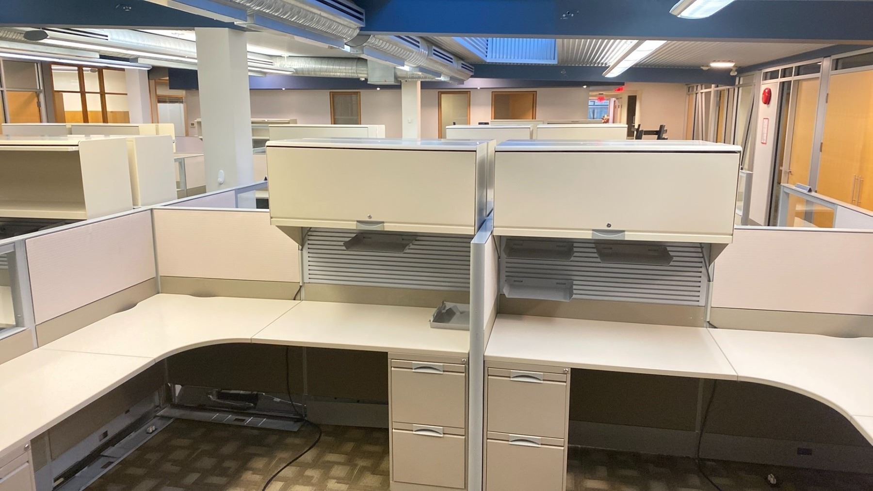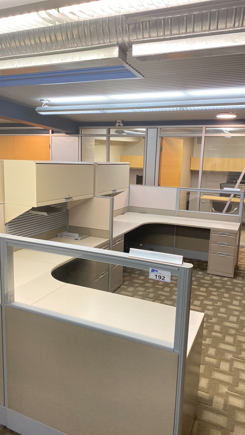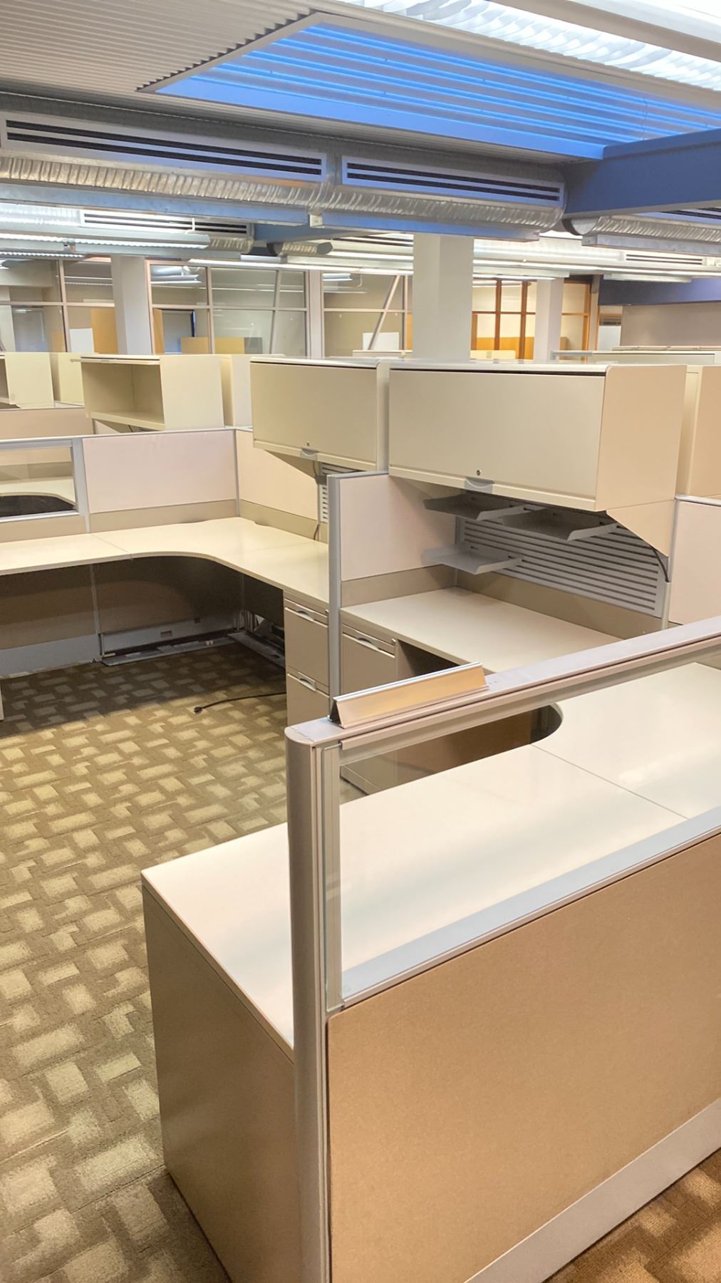 4 DESKS DOUBLE SIDED WITH CUBICLE WALLS OFFICE WORK STATION SYSTEM *APPROX. DIMENSIONS 13FT ACROSS X 12FT WIDE X 4FT HIGH*