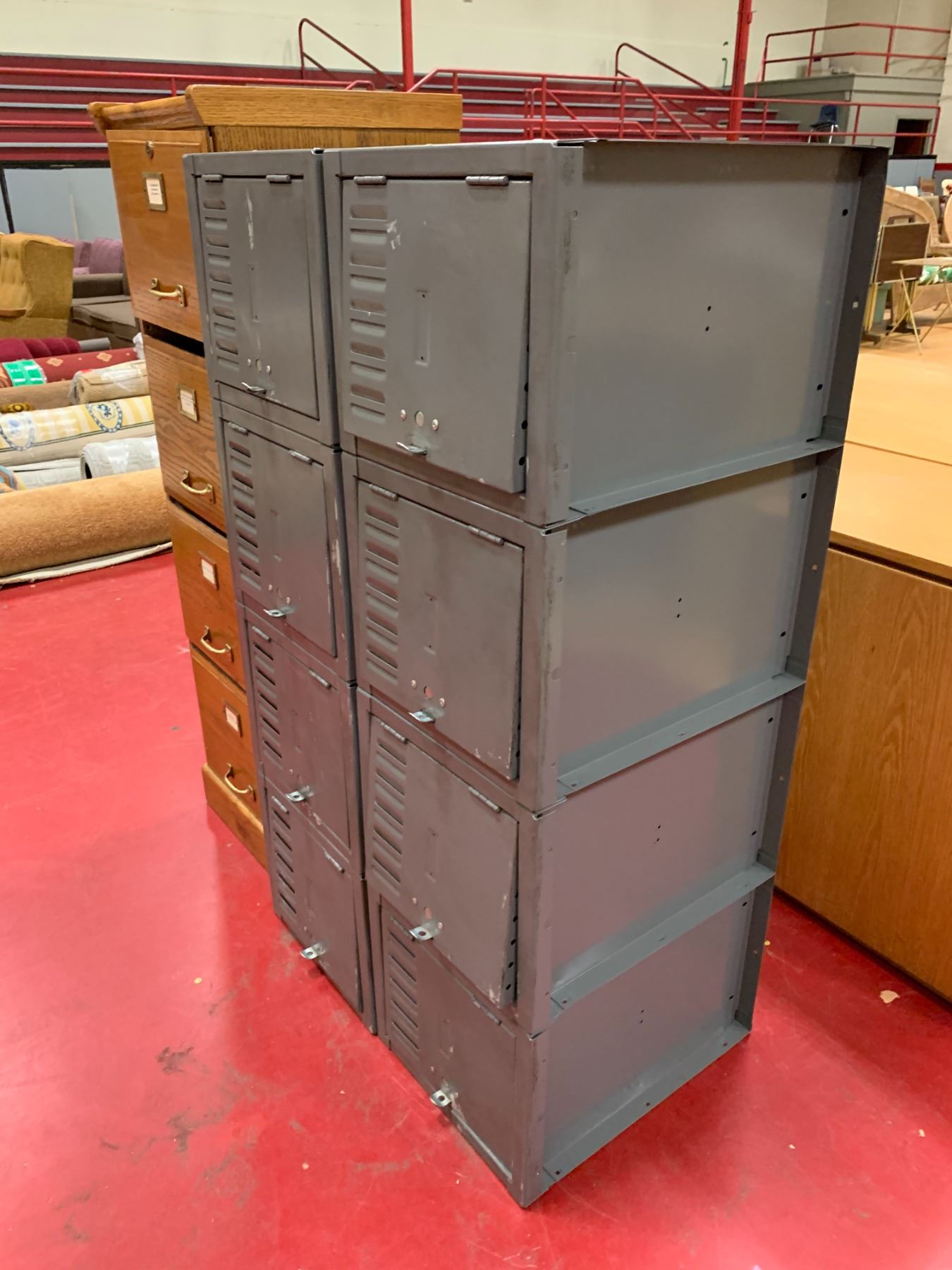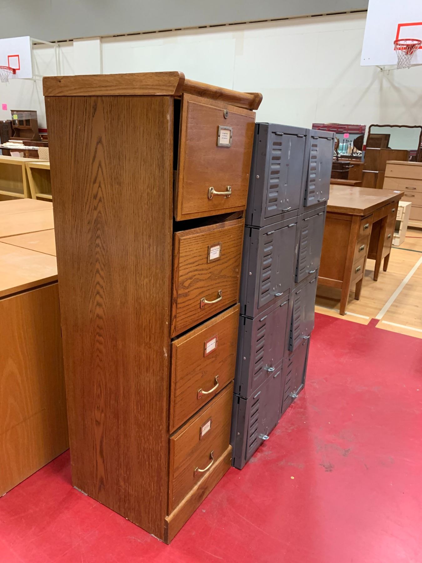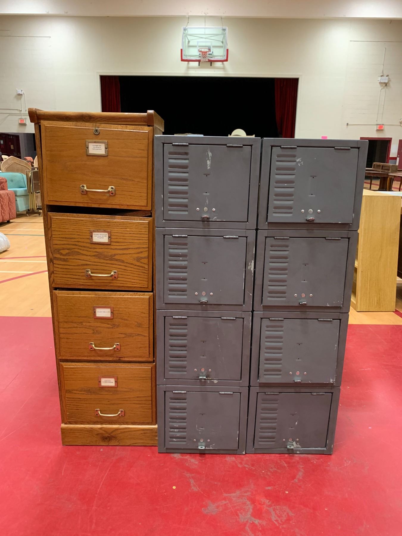 4 DRAWER WOOD FILING CABINET APPROX 51"X16"X16" & 2 4 DOOR METAL LOCKERS APPROX 48"X14"X18"