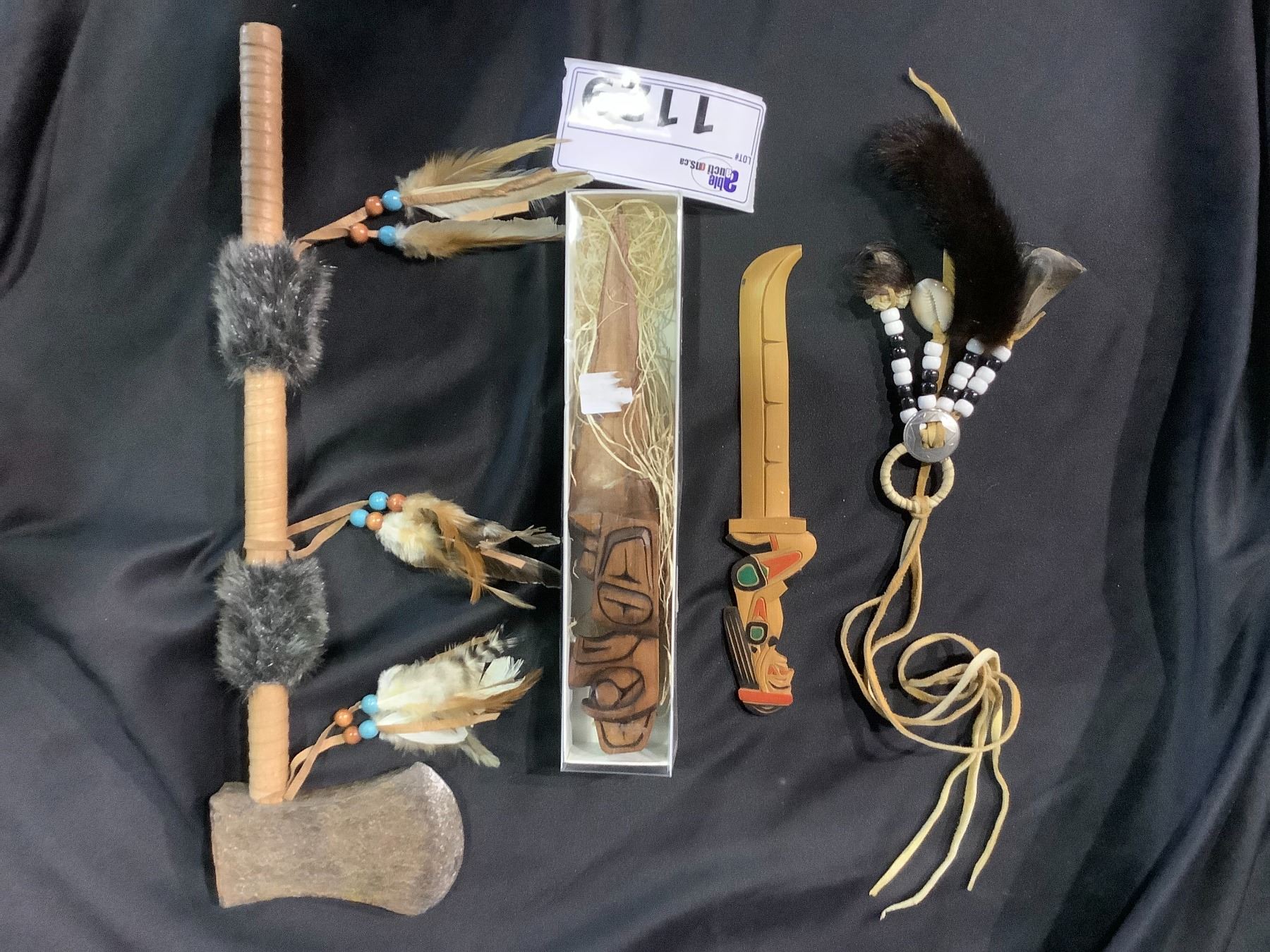 4 FIRST NATION PIECES (KNIFE, HATCHET, BOOK MARKER & NECKLACE)