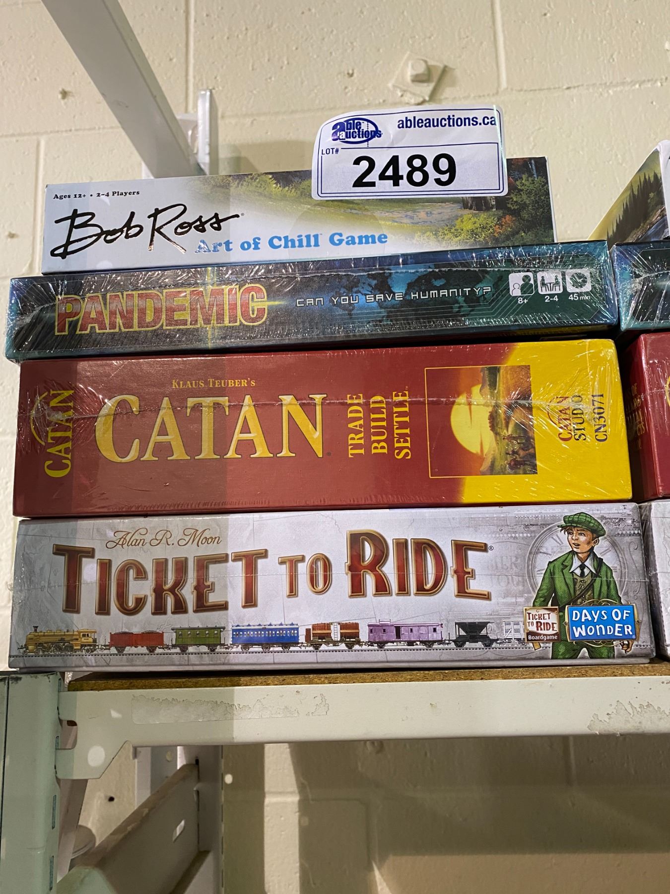 4 GAMES (3 NEW IN PACKAGING): TICKET TO RIDE, SETTLERS OF CATAN, PANDEMIC, BOB ROSS ART OF CHILL