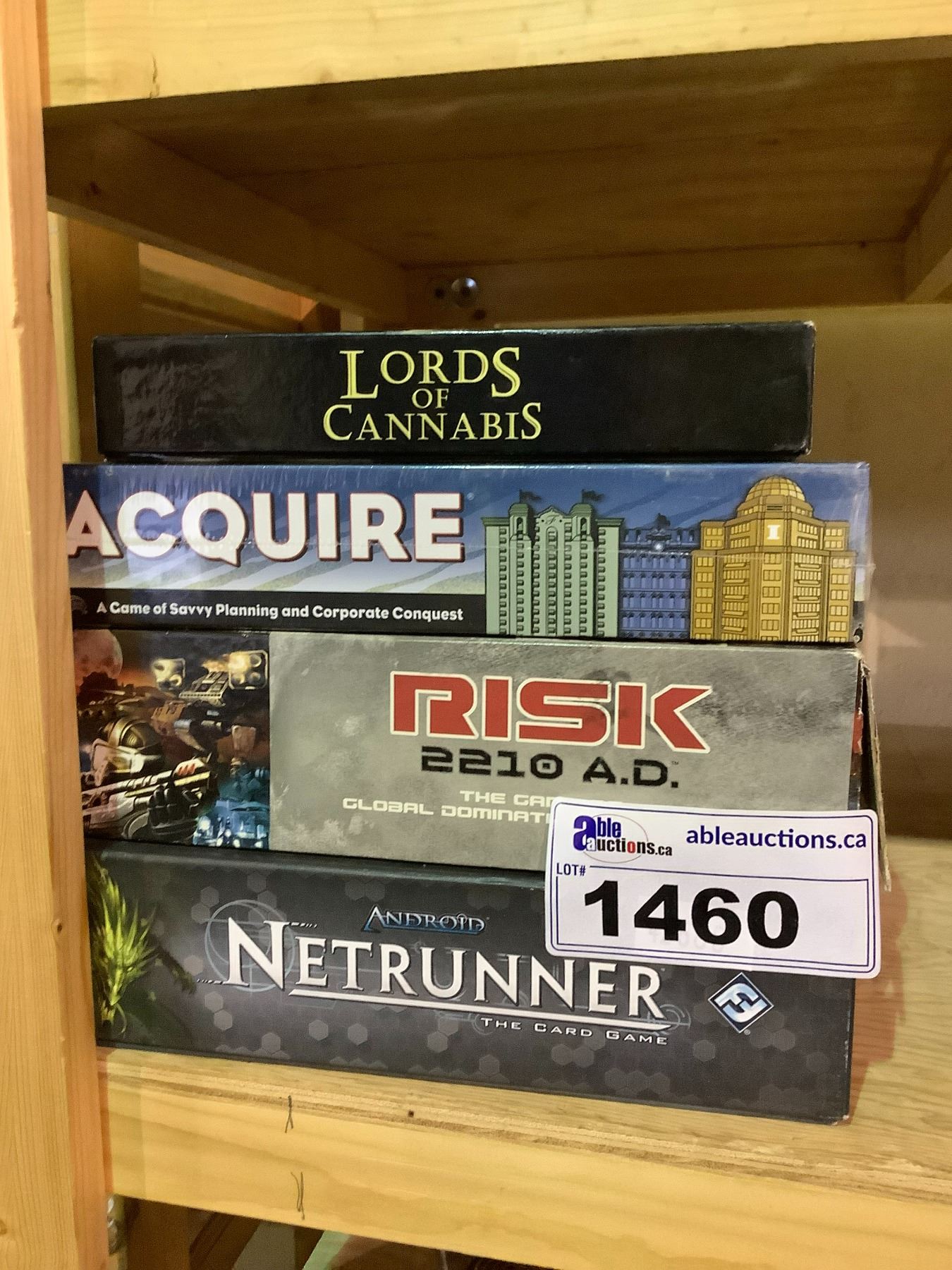4 GAMES: LORD OF CANNABIS, ACQUIRE (NEW AND SEALED), RISK 2210 A.D., & NETRUNNER