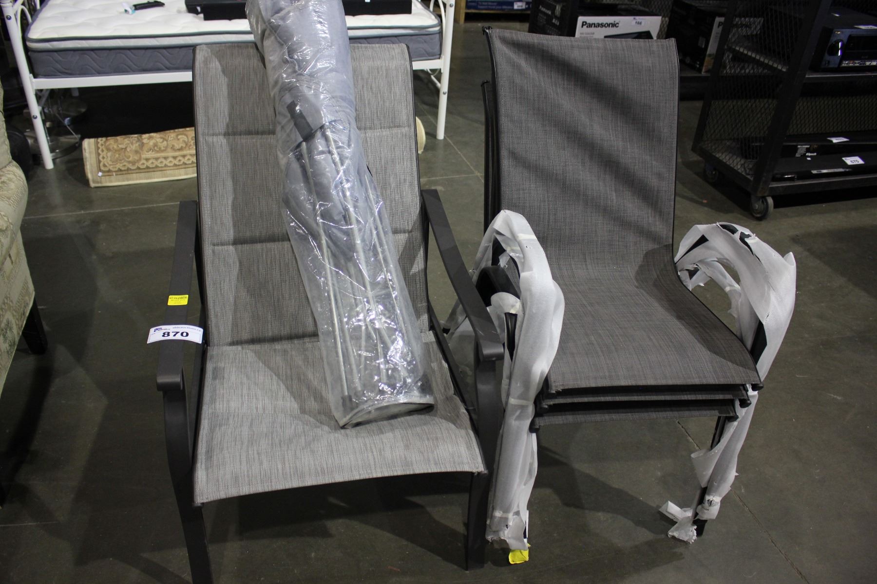 4 GREY PATIO CHAIRS AND SOFT FOLD-OUT CHAIR