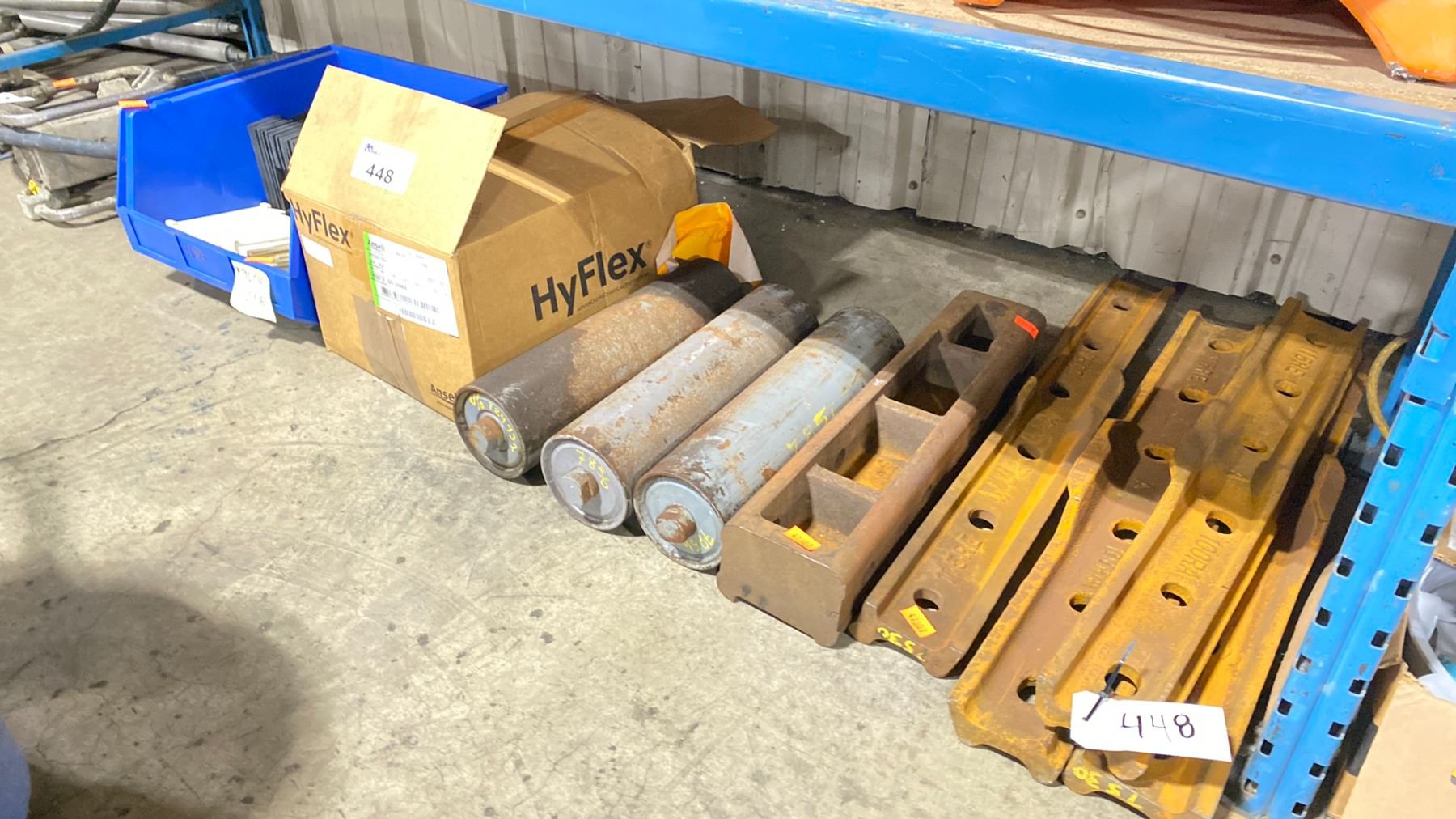 4 HEAVY DUTY 100RA BENDING DIES, 3 LARGE HEAVY DUTY ROLLERS, BOX OF RUBBER DIVIDERS, & PARTS BIN OF RUBBER DIVIDERS *BIN INCLUDED*