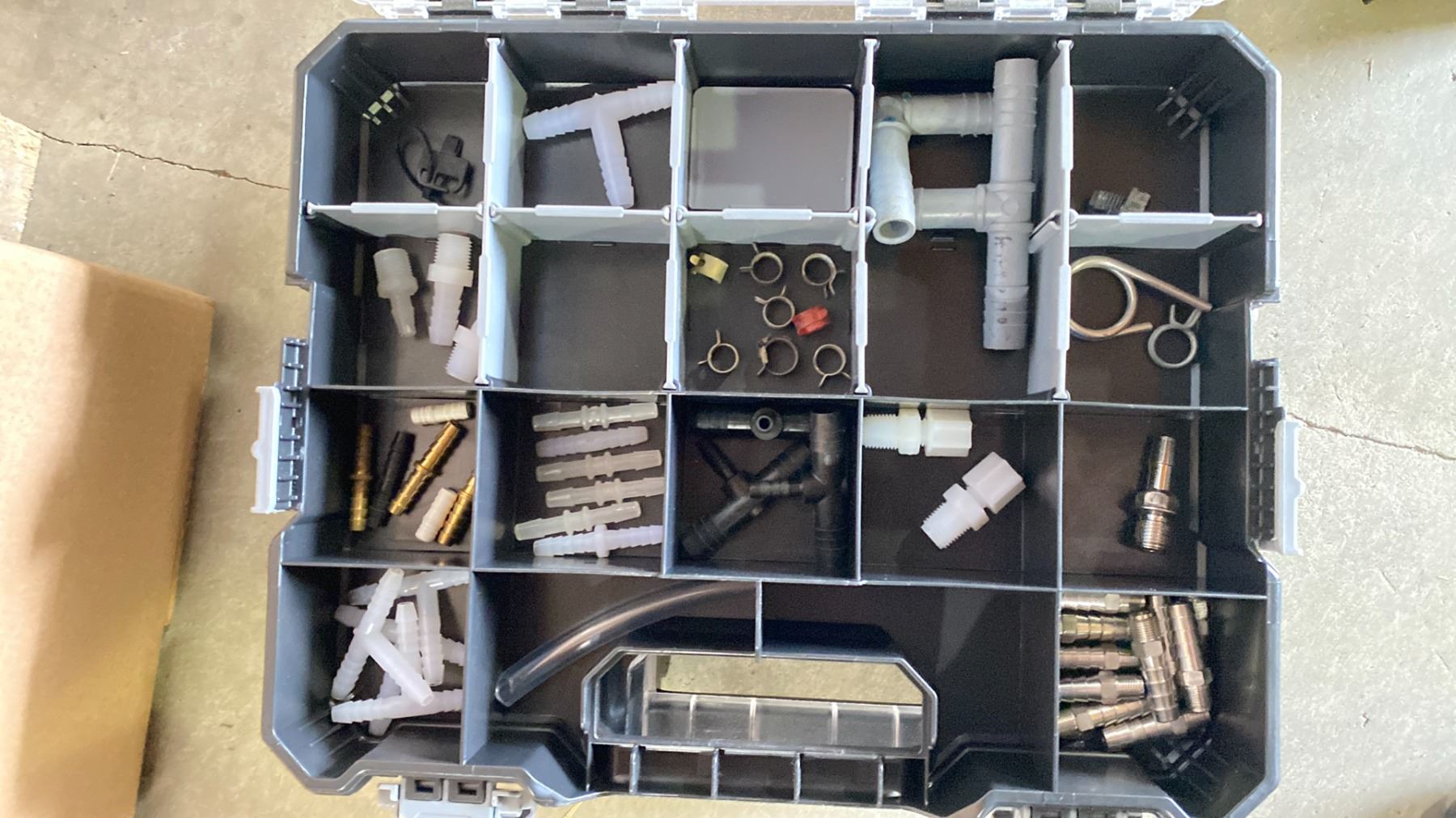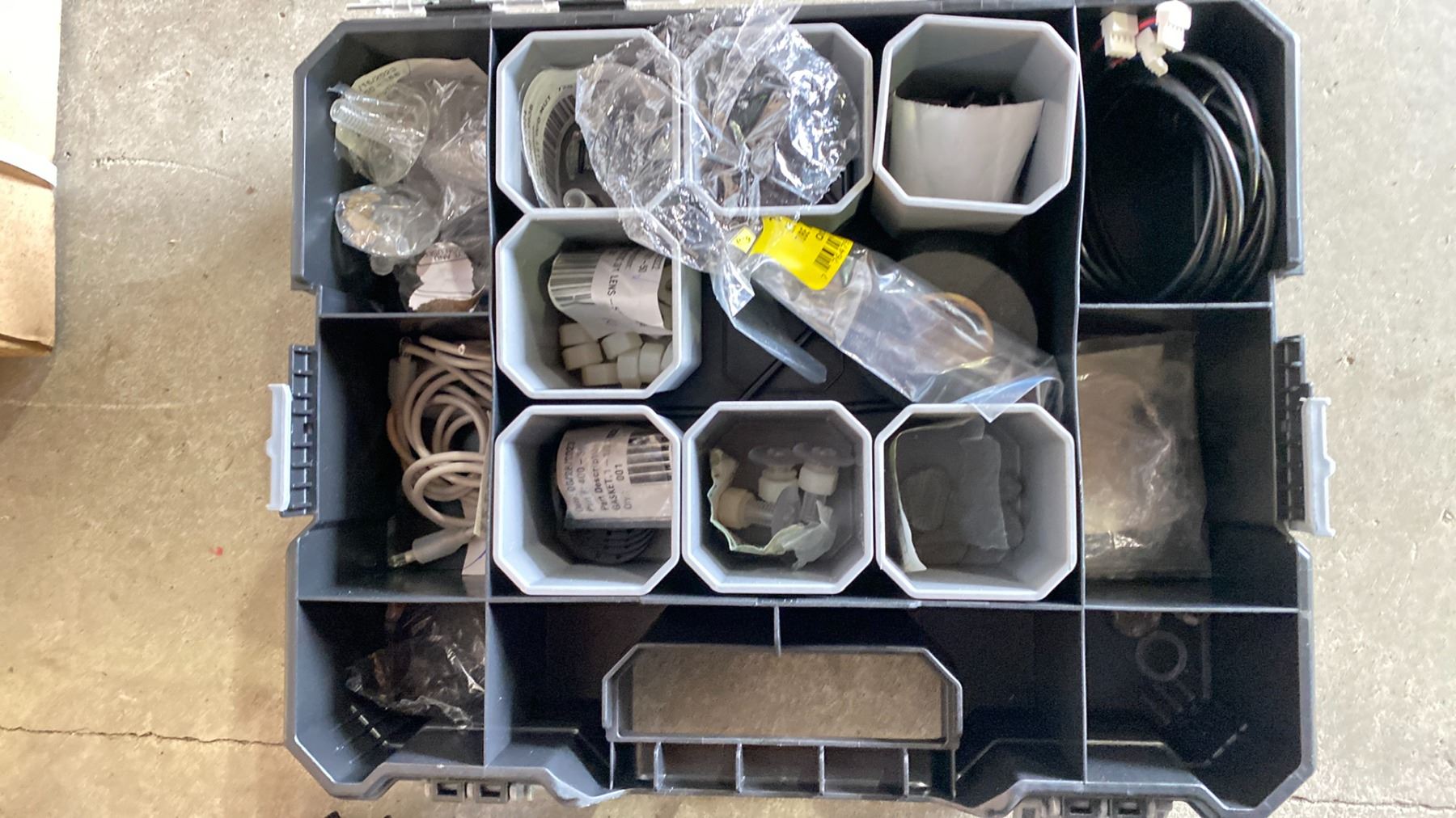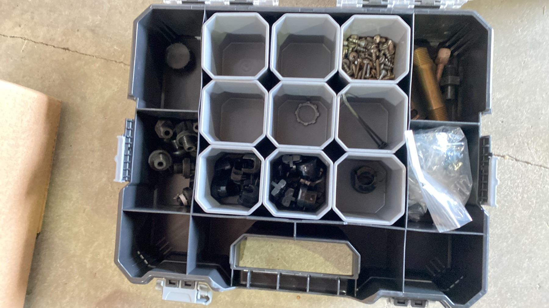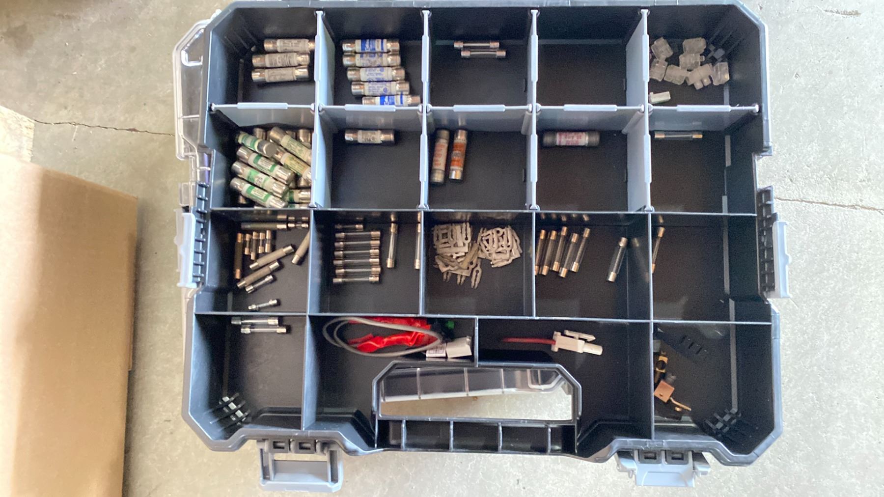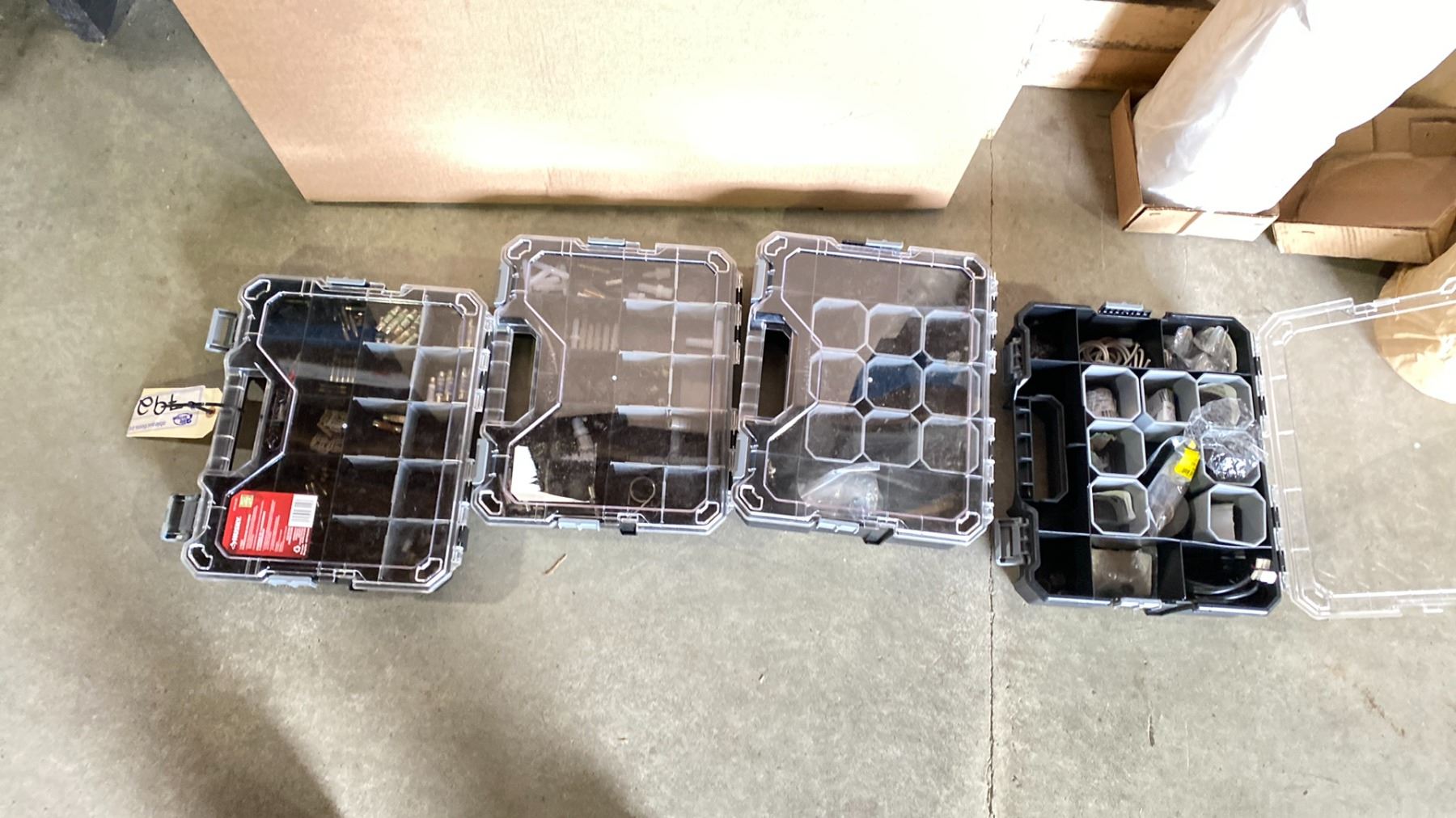 4 HUSKY PARTS BINS WITH LARGE FUSE ASST, PLASTIC PIPE FITTINGS, SCREWS, ETC