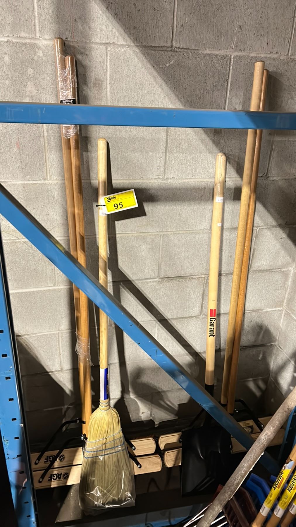 4 INDUSTRIAL PUSH BROOMS, GARANT SHOVEL, & OUTDOOR CORN BROOM
