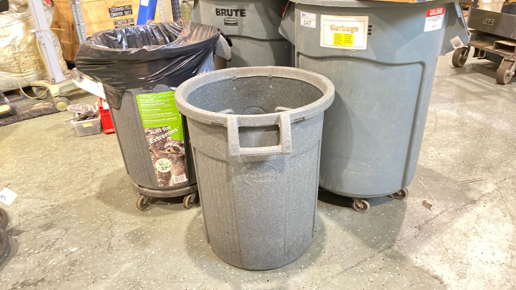 4 INDUSTRIAL WASTE RECEPTACLES - 2 ULINE 55 GALLON ON CASTORS , 30 GALLON 1 ON CASTORS 1 NOT