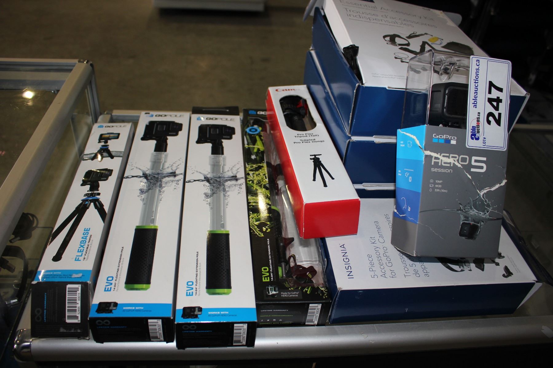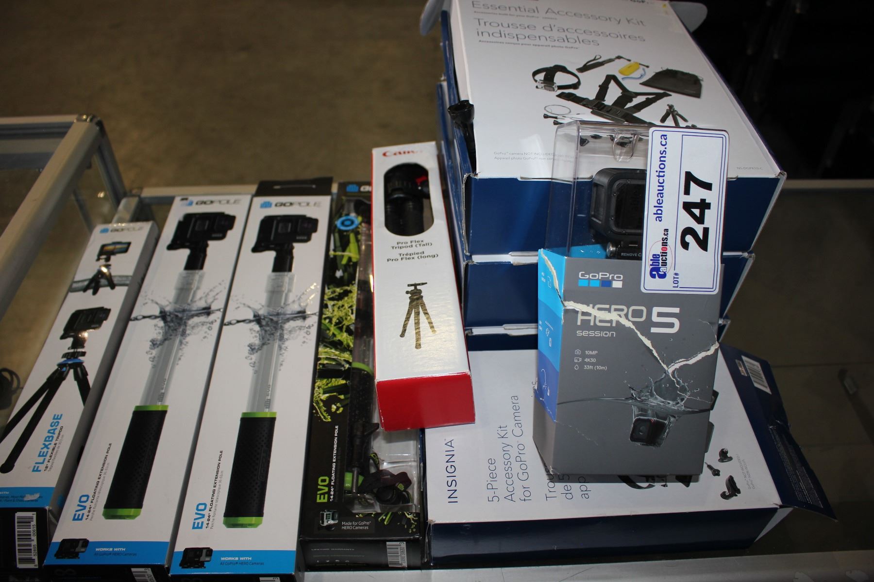 4 INSIGNIA GOPRO ACCESSORY KITS, 5 TRIPODS/MONOPODS, AND GOPRO HERO 5
