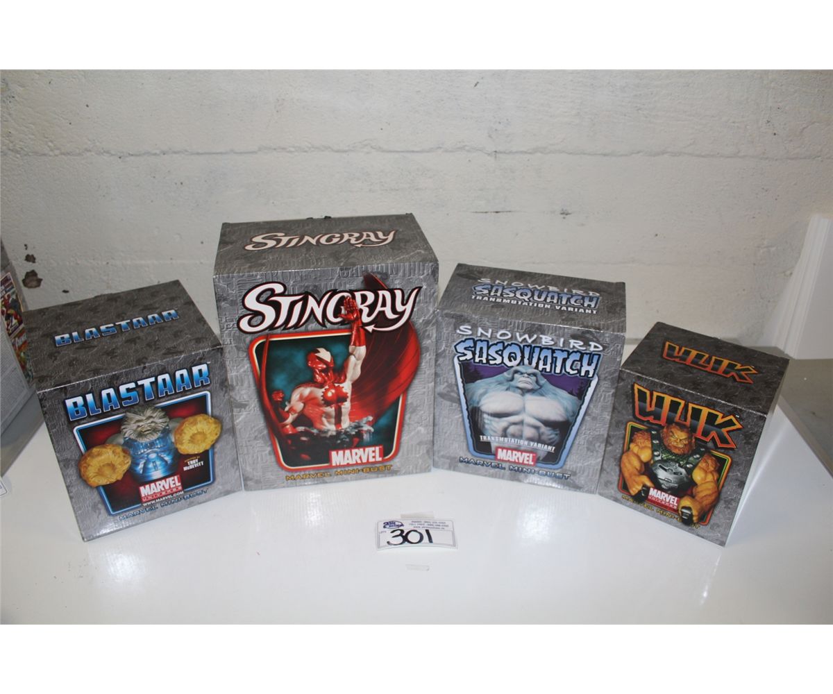 4 MARVEL MINI BUSTS, NEW IN BOX INCLUDING: BLASTAAR 520/1000, ULIK 81/1000, SNOWBIRD SASQUATCH 1185/2000 AND STINGRAY 1596/1700