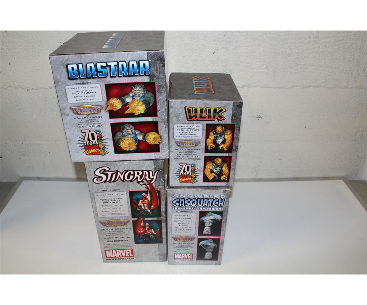 4 MARVEL MINI BUSTS, NEW IN BOX INCLUDING: BLASTAAR 520/1000, ULIK 81/1000, SNOWBIRD SASQUATCH