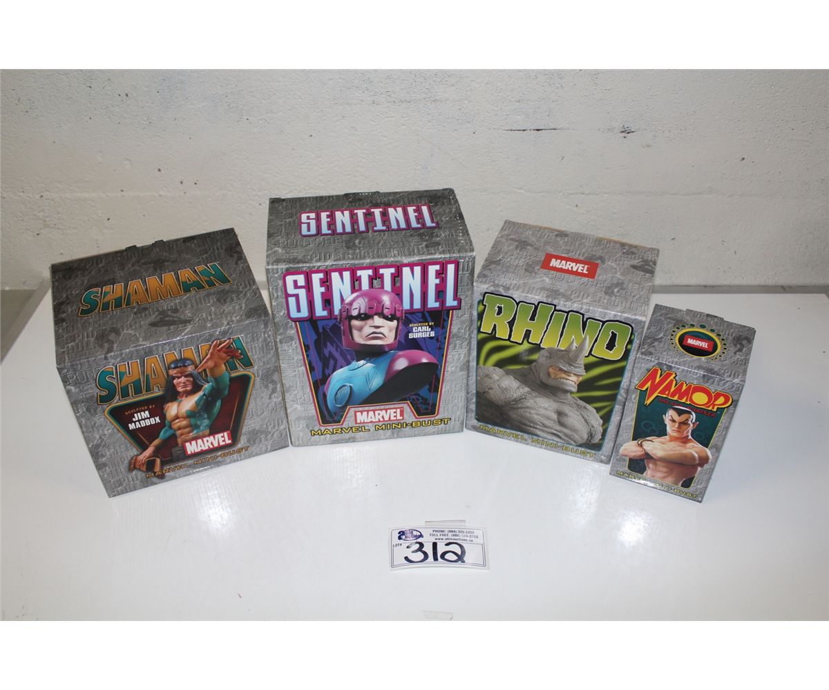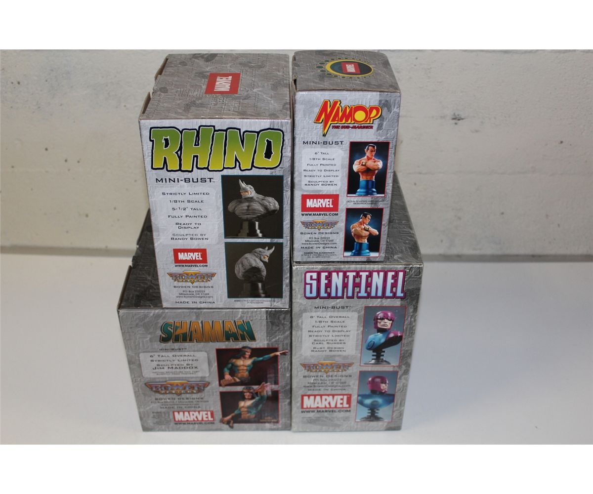 4 MARVEL MINI BUSTS, NEW IN BOX INCLUDING: RHINO 5917/6000, NAMOR 2800/5000, SHAMAN 656/1500 AND SENTINEL 1537/3000