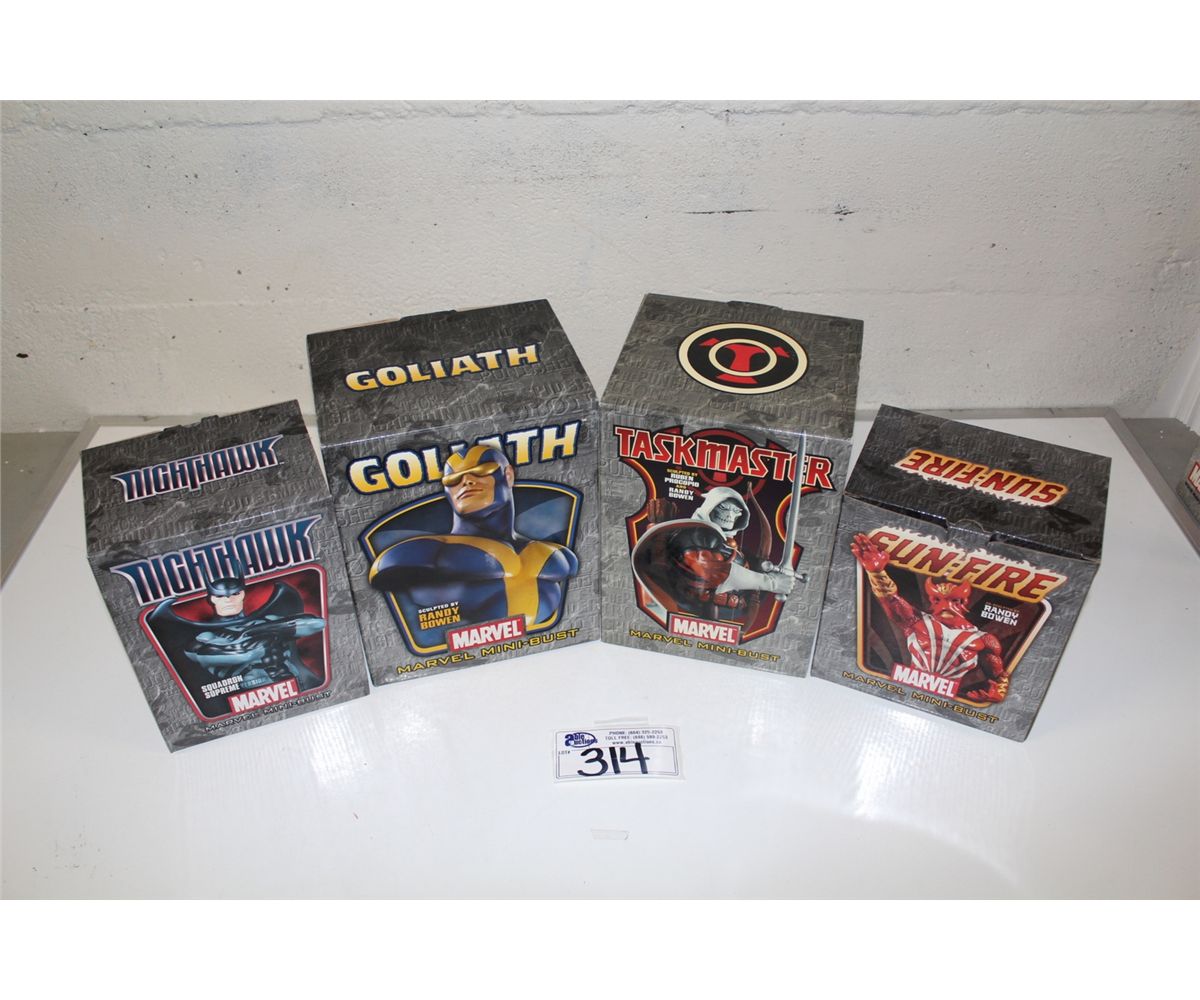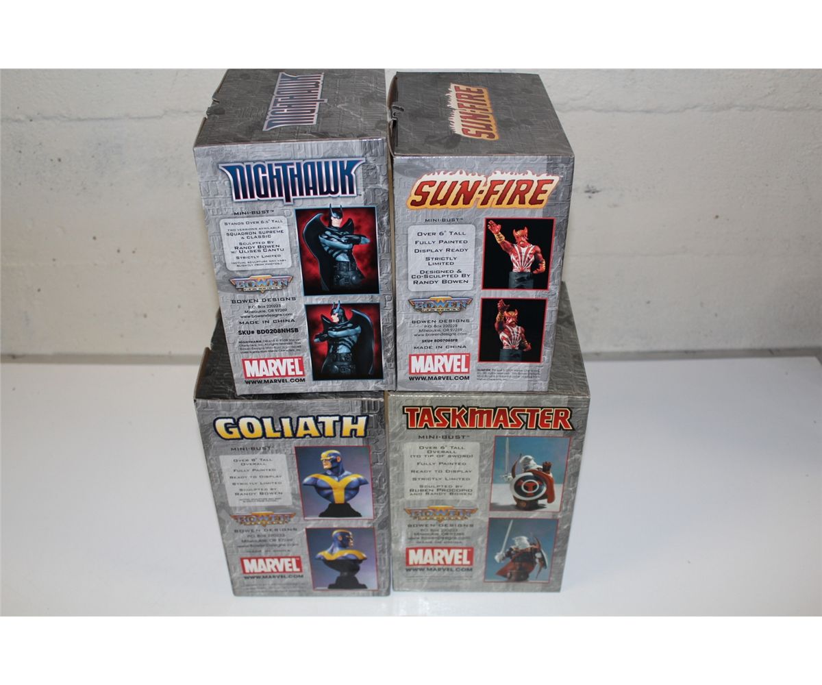4 MARVEL MINI BUSTS, NEW IN BOX INCLUDING: SUN-FIRE 728/1800, TASKMASTER 1693/3000, GOLIATH 1250/2500 AND NIGHTHAWK 1333/1500