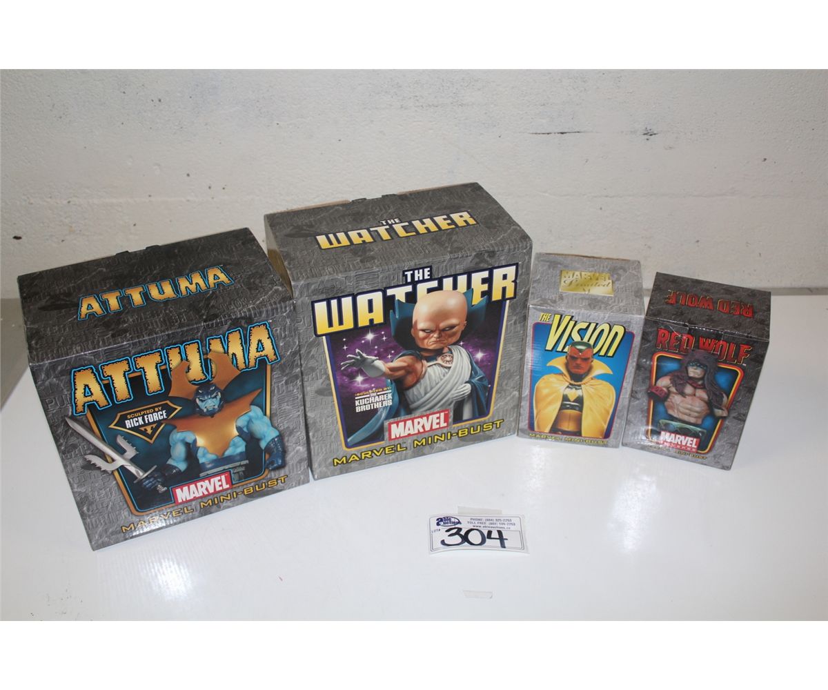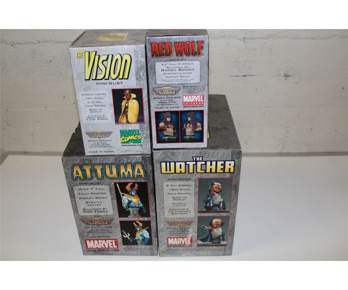 4 MARVEL MINI BUSTS, NEW IN BOX INCLUDING: THE VISION 1245/5000, RED WOLF 73/1000, ATTUMA 1103/1500 AND THE WATCHER 1119/3000