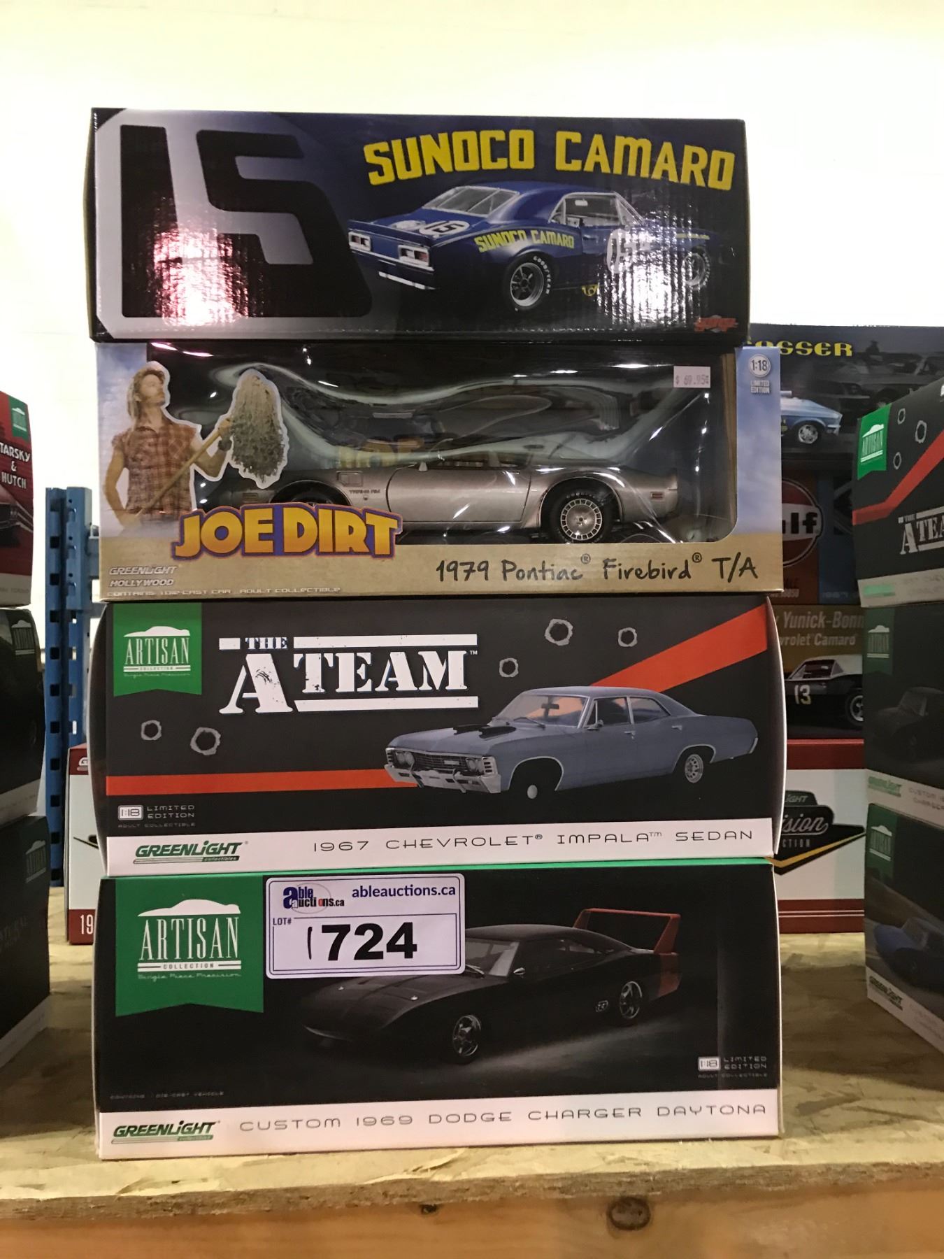 4 NEW IN BOX MODEL CARS: 1979 FIREBIRD (JOE DIRT), 1967 IMPALA (A-TEAM), 1969 CHARGER DAYTONA, SUNOCO CAMARO
