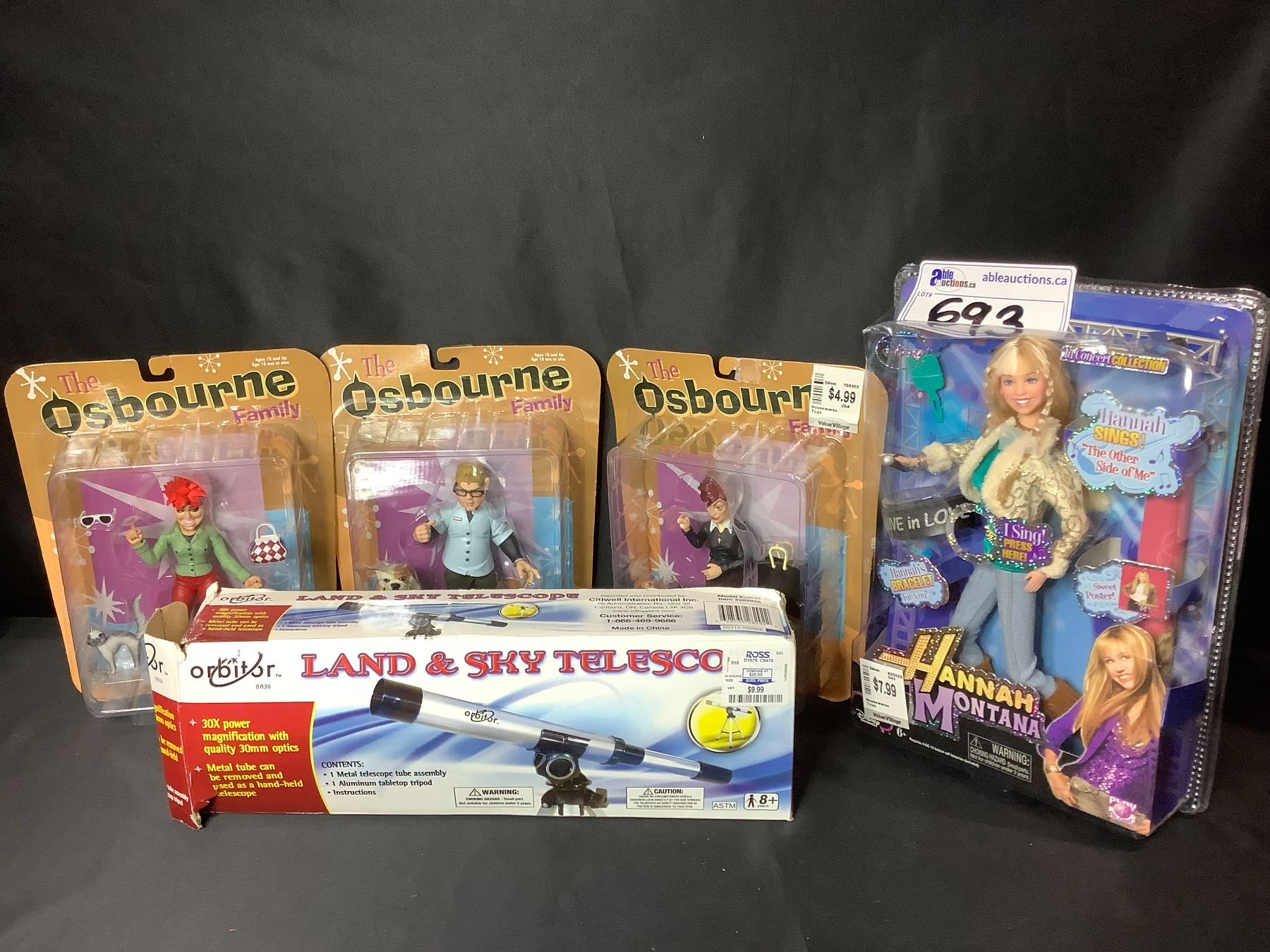 4 NEW TOYS: THE OSBOURNE FAMILY, HANNAH MONTANA & 1 ORBITOR LAND AND SKY TELESCOPE