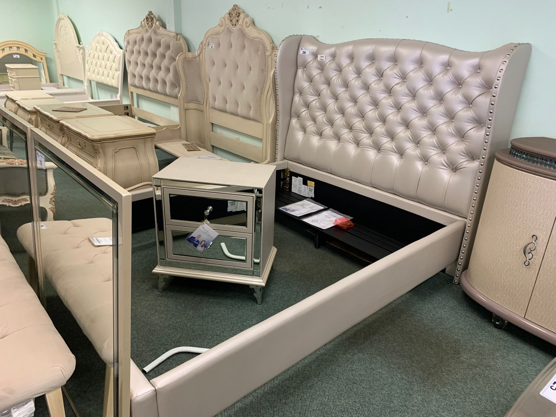 4 PCS MICHAEL ARMINI QUEEN SIZE GREY STUDDED BEDROOM SUIT INCLUDING ; HEADBOARD, FOOTBOARD, SIDERAILS & 2 DRAWER NIGHT STAND