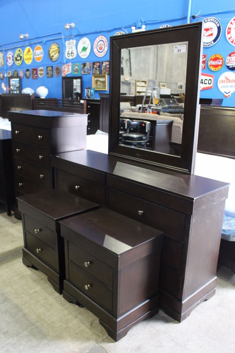 4 PIECE BEDROOM SUITE INCLUDING DRESSER WITH MIRROR, HIGHBOY AND 2 NIGHTSTANDS