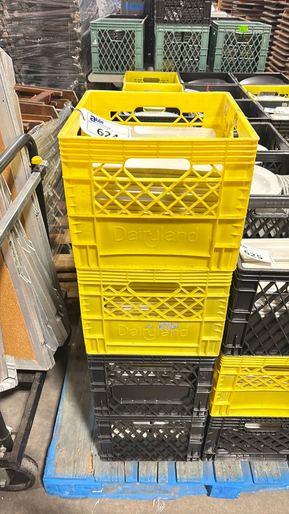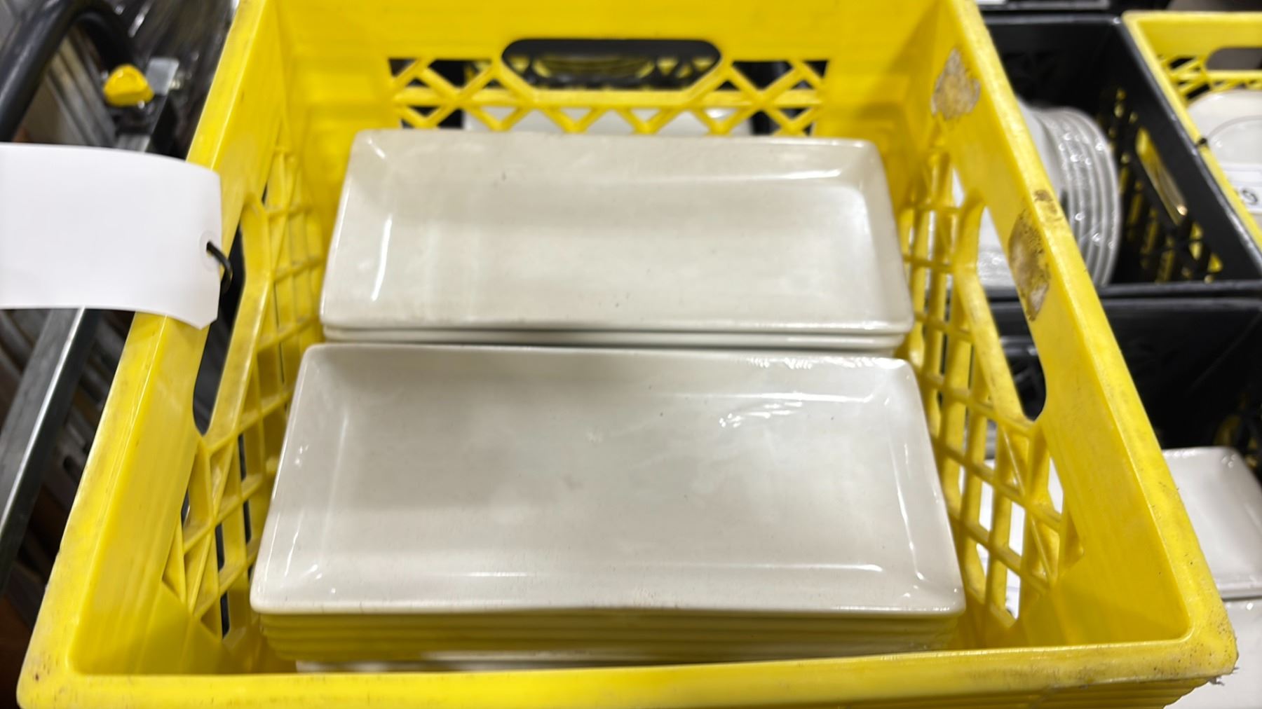 4 PLASTIC CRATES OF 10"W RECTANGLE COMMERCIAL RESTAURANT APPETIZER PLATES *PLASTIC CRATES INCLUDED* ( APPROX. 30 PLATES PER CRATE )