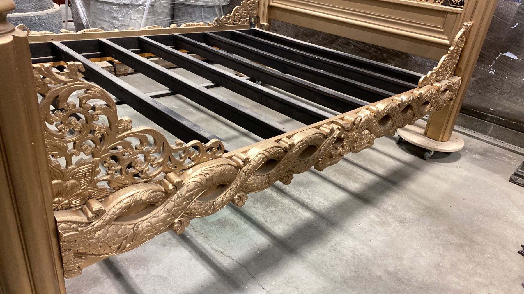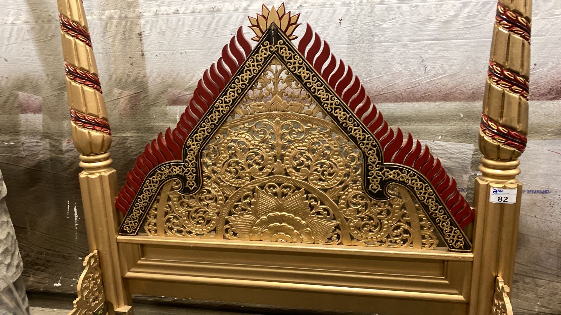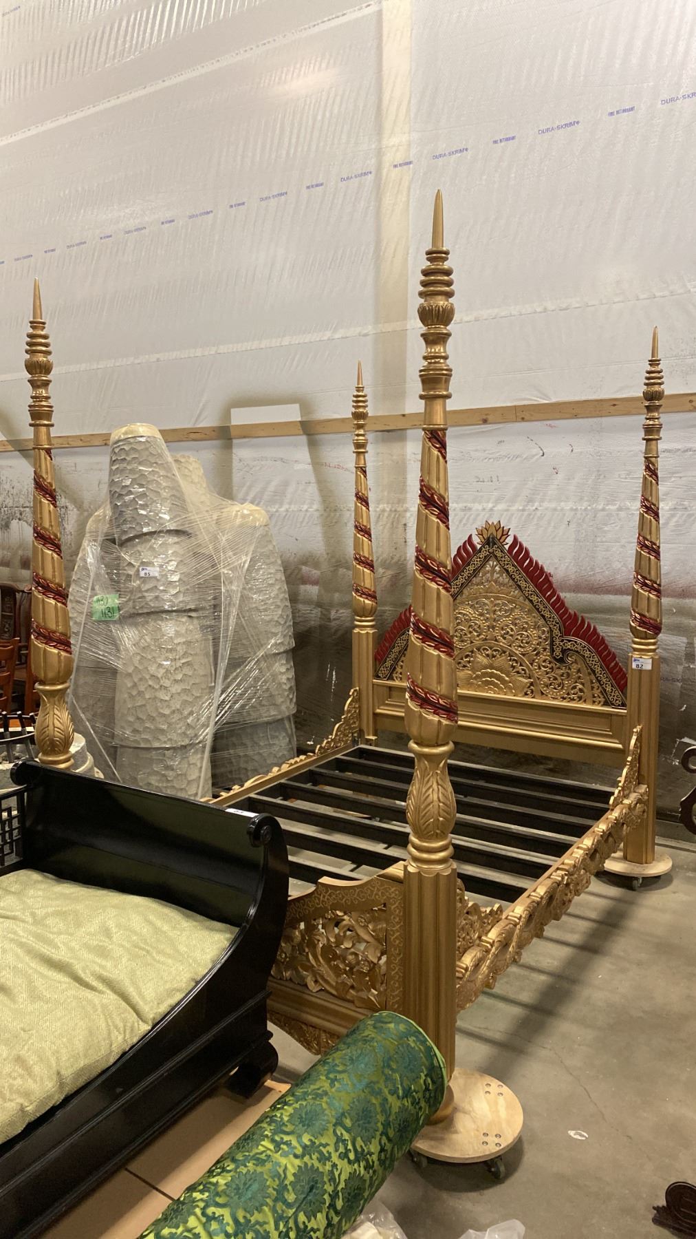 4 POSTER QUEEN SIZE BED FRAME PAINTED GOLD, RED & BLACK OVER SOLID MAHOGANY