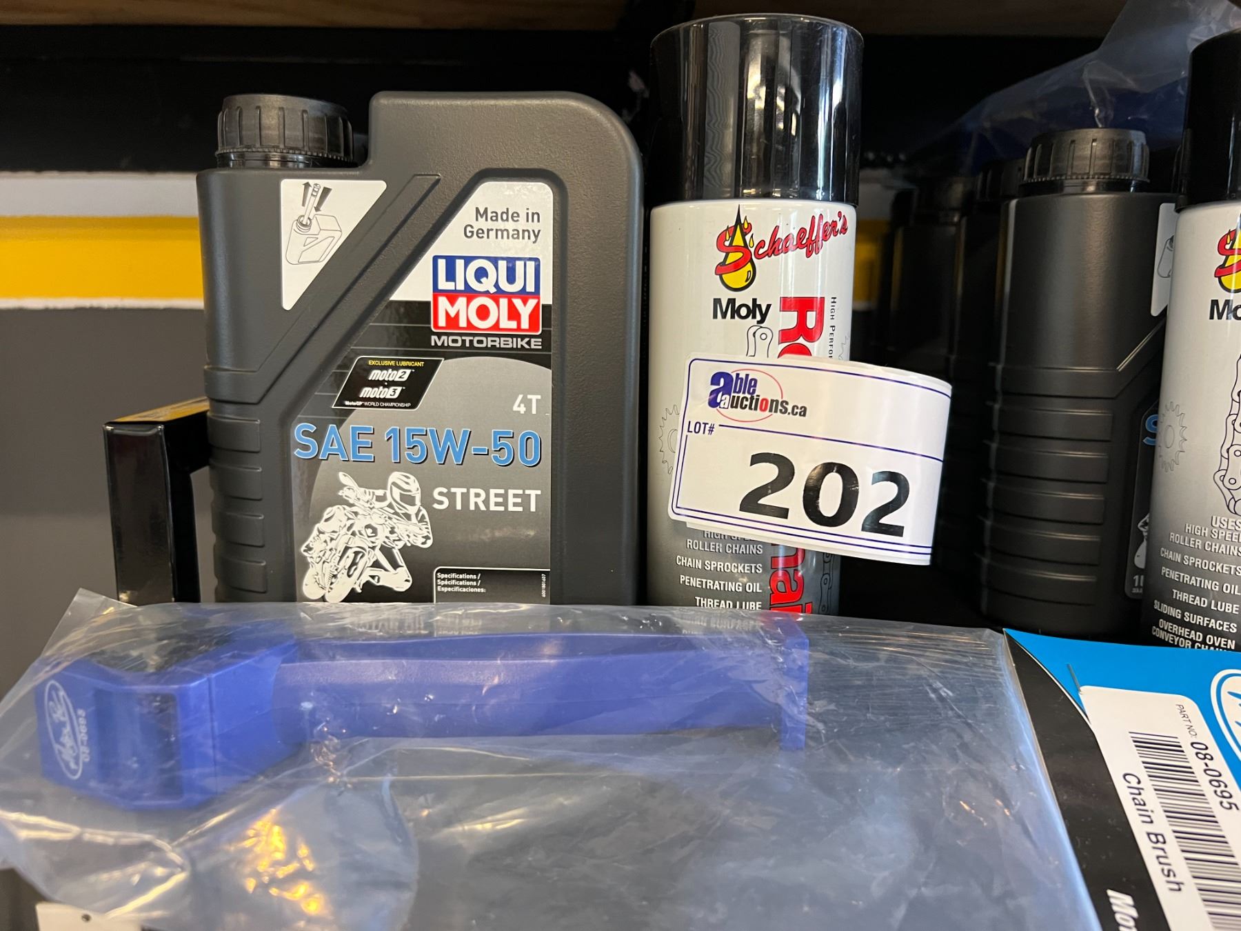 4 QUARTS LIQUI MOLY 15W/50 SYNTHETIC OIL, CAN SPAY LUBE & CHAIN CLEANING BRUSH