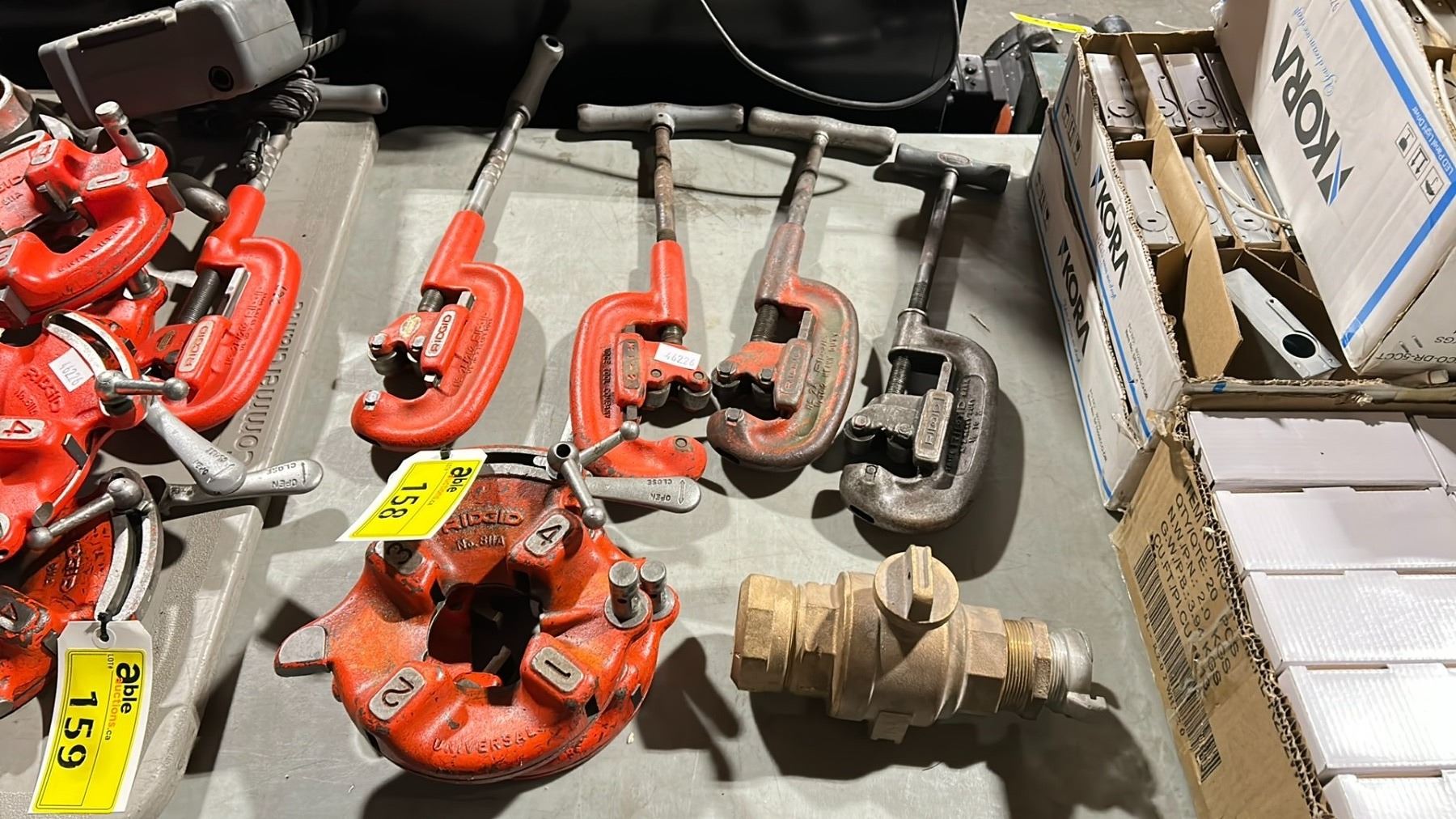 4 RIDGID THREE WHEEL HEAVY DUTY PIPE CUTTERS & 2 RIDGID 811A 1/8" 2" NPT DIE HEADS & A PIPE FITTING
