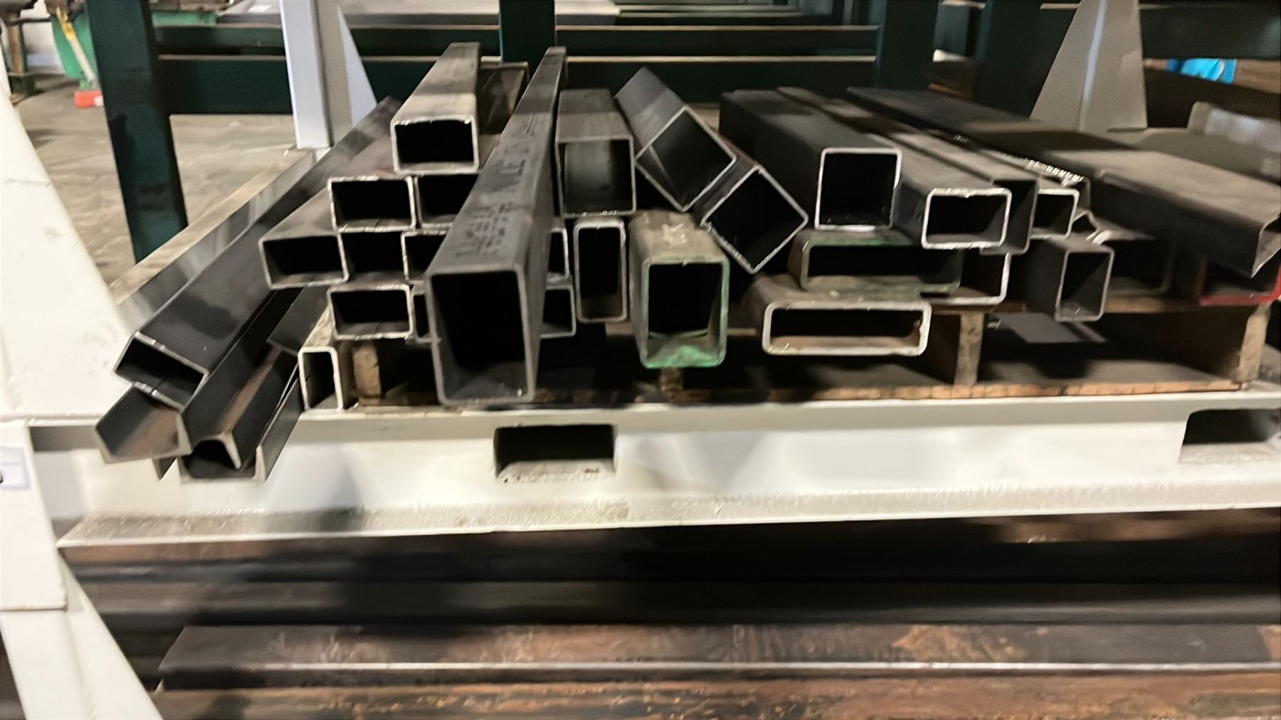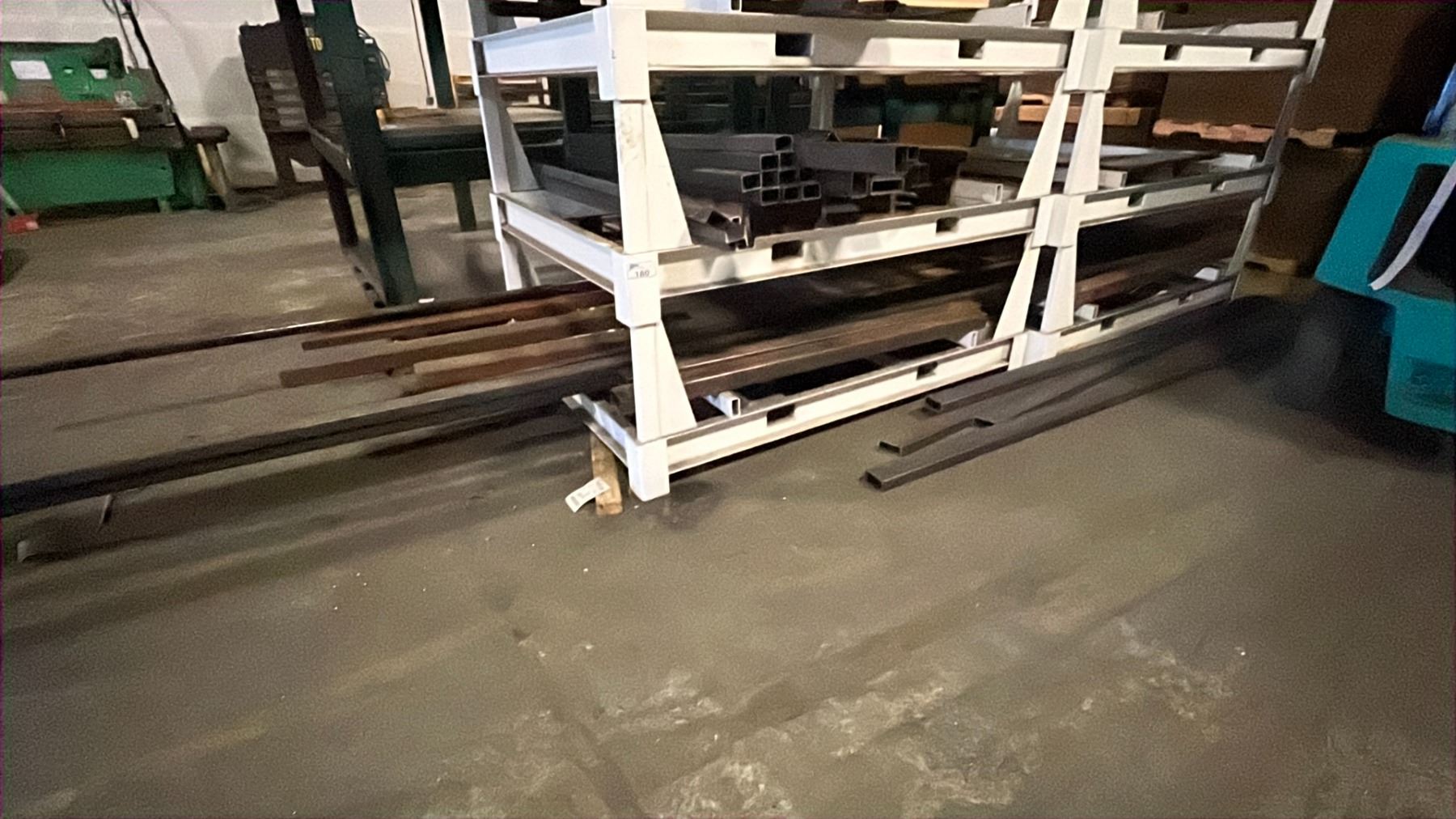 4 SECTIONS OF INDUSTRIAL MATERIAL RACKING APPROX (29"H X 84"L X 64"D ) PER SECTION WITH ASSORTED METAL FABRICATING MATERIALS INCLUDING SQUARE BAR, SHEETS & ROUND PIPE