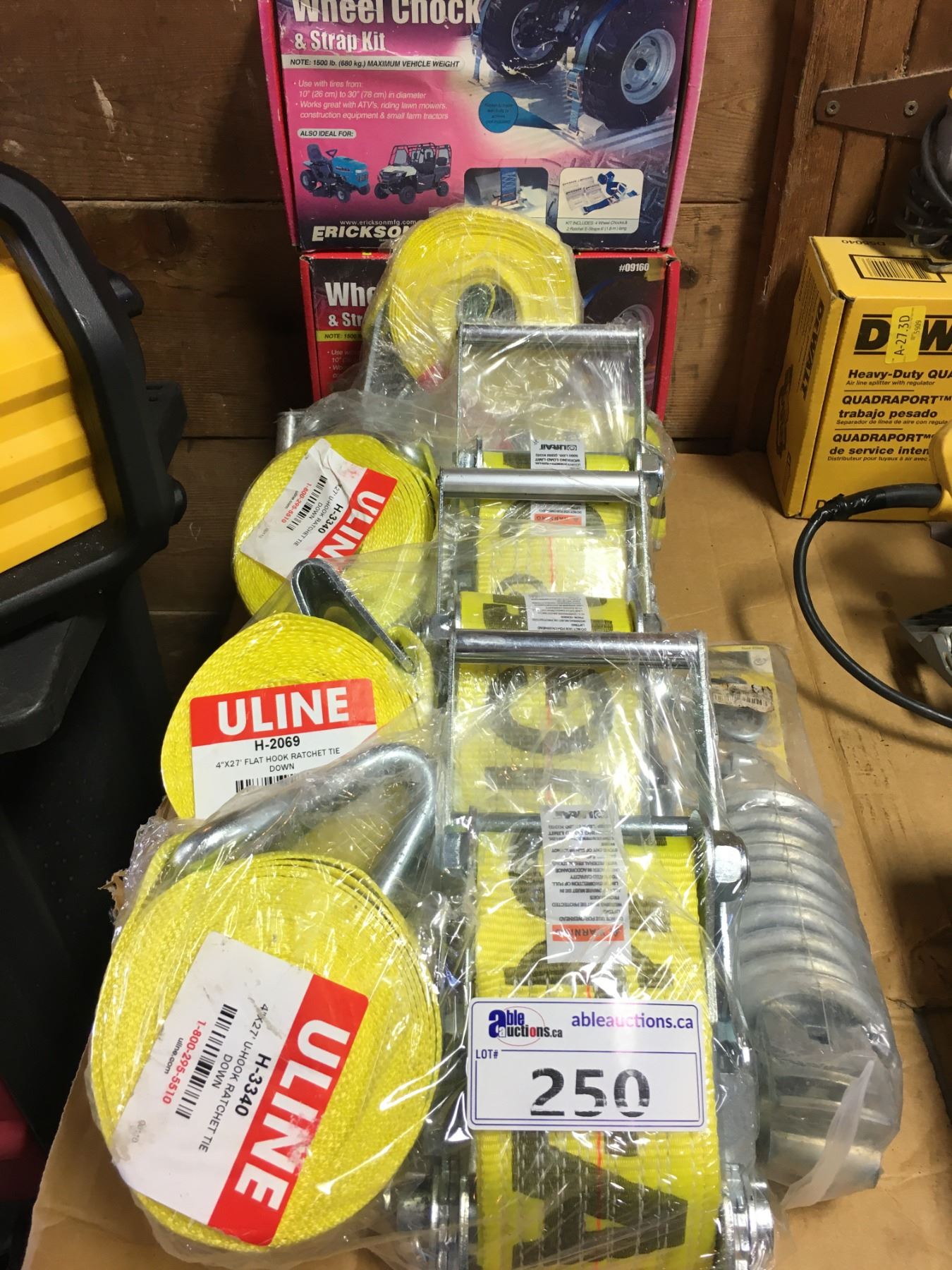 4 SETS OF ULINE HOOK RATCHET TIE-DOWNS, 2 WHEEL CHOCK & STRAP KITS AND 2 PACKAGES OF MOUNTS
