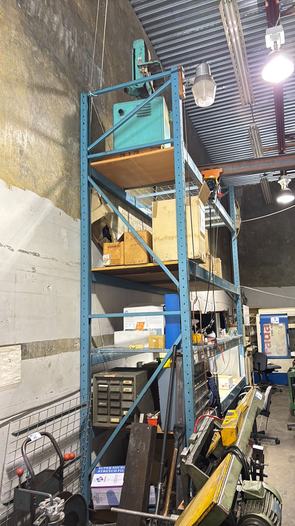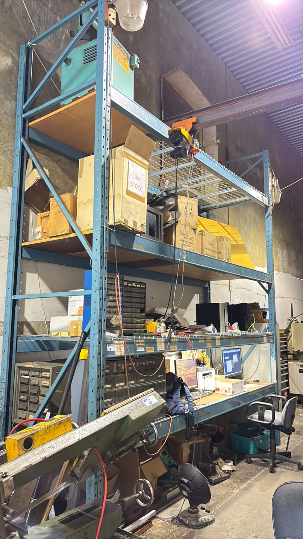 4 SHELF, 135"W SINGLE BAY OF BLUE INDUSTRIAL PALLET RACKING WITH WOOD, MESH DECKING & ASSORTED CONTENTS *COMPUTERS & COMPUTER COMPONENTS NOT INCLUDED* *MUST HAVE PROPER TOOLS & EQUIPMENT TO DISMANTLE*