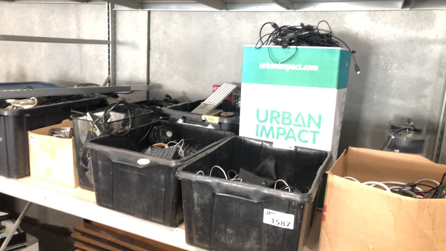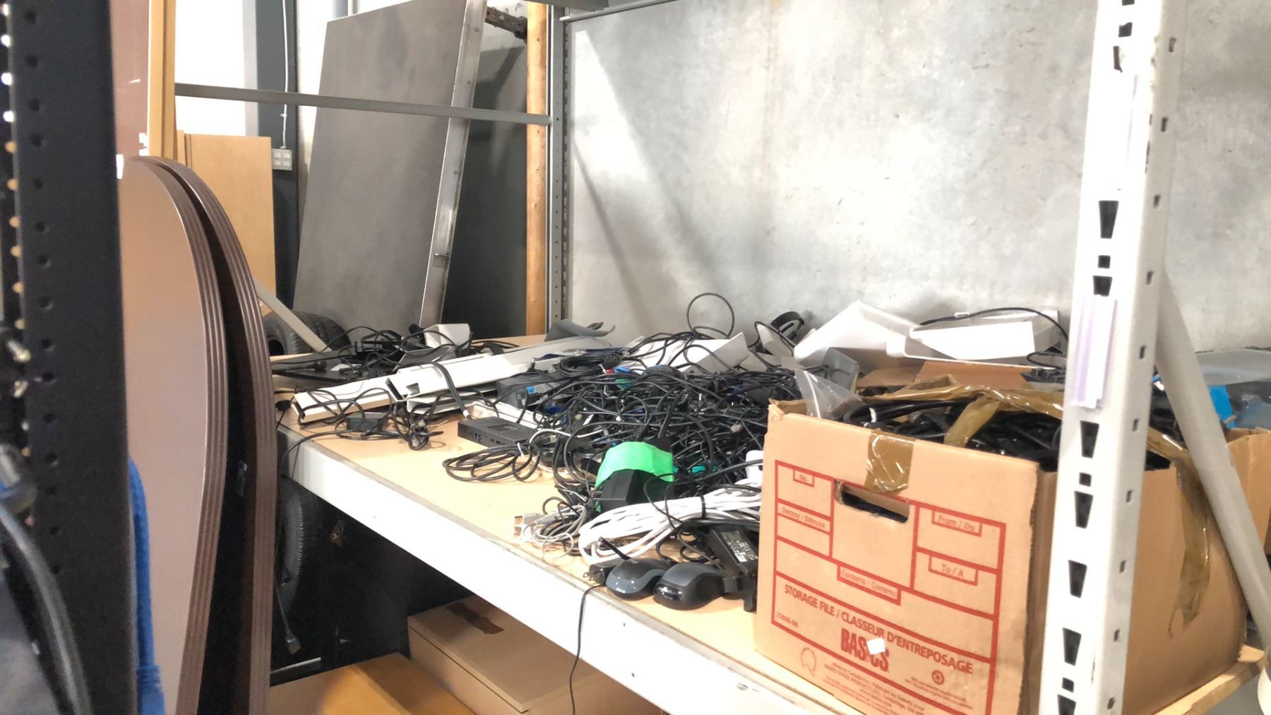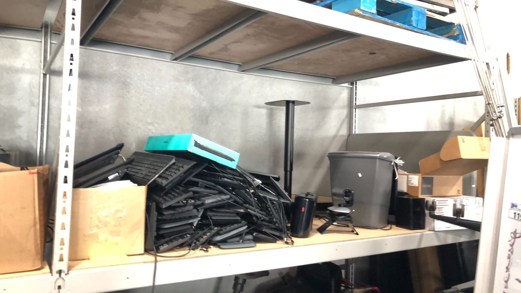 4 SHELVES OF MISC CABLES, KEYBOARDS AND MORE - MUST TAKE ALL