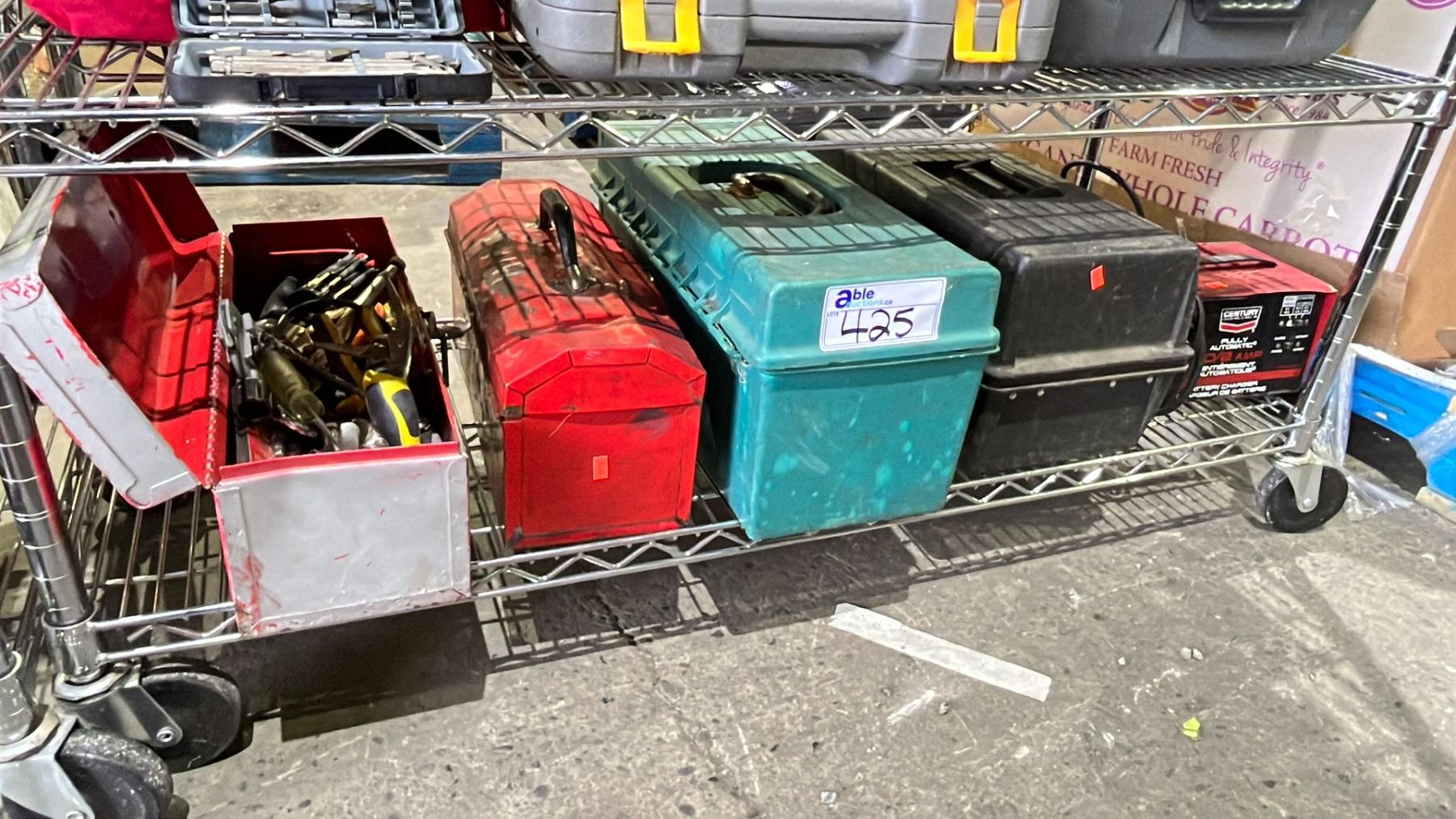 4 SMALL ASSORTED TOOLBOXES WITH CONTENTS & A CENTURY FULL AUTOMATIC BATTERY CHARGER