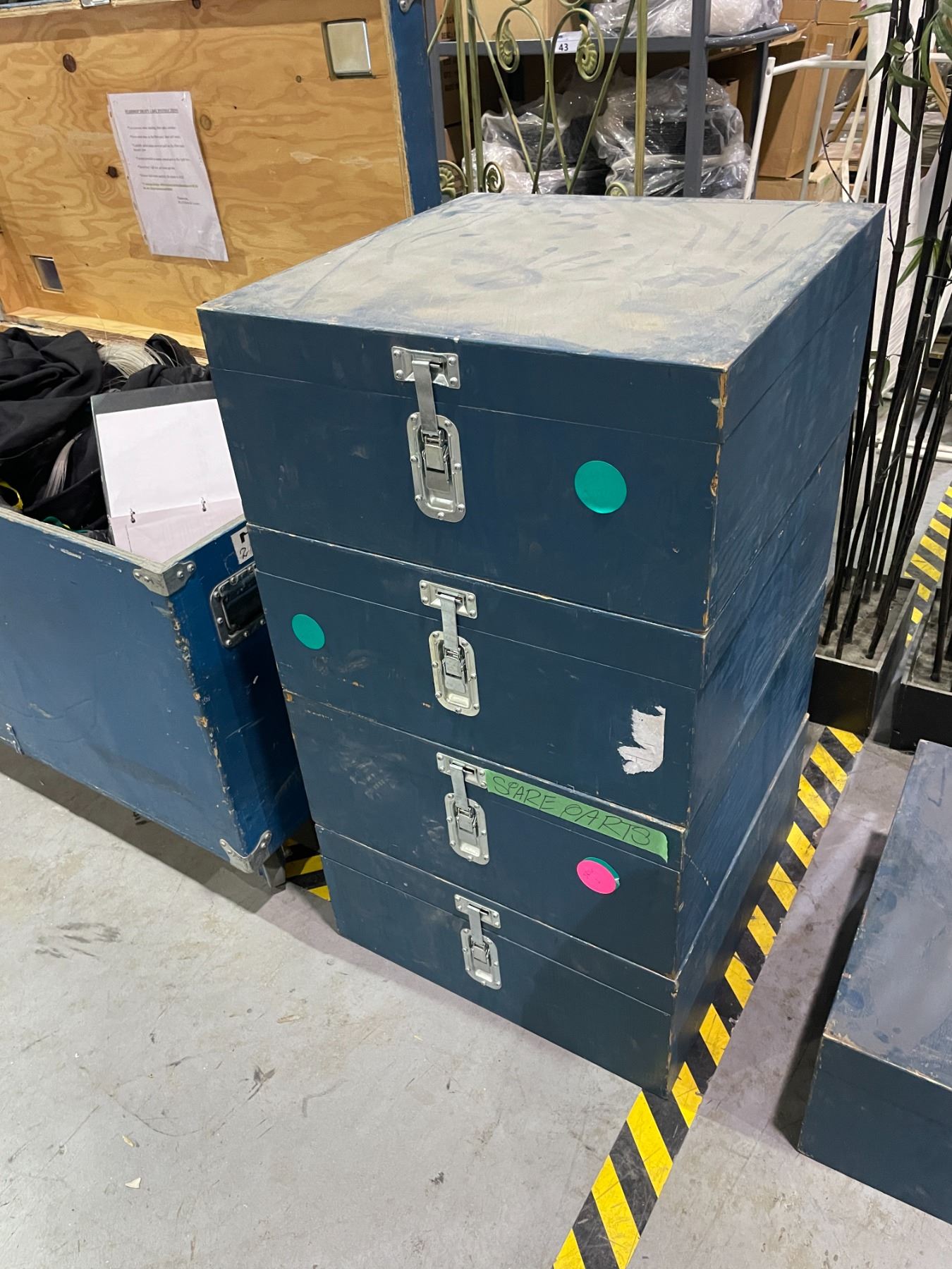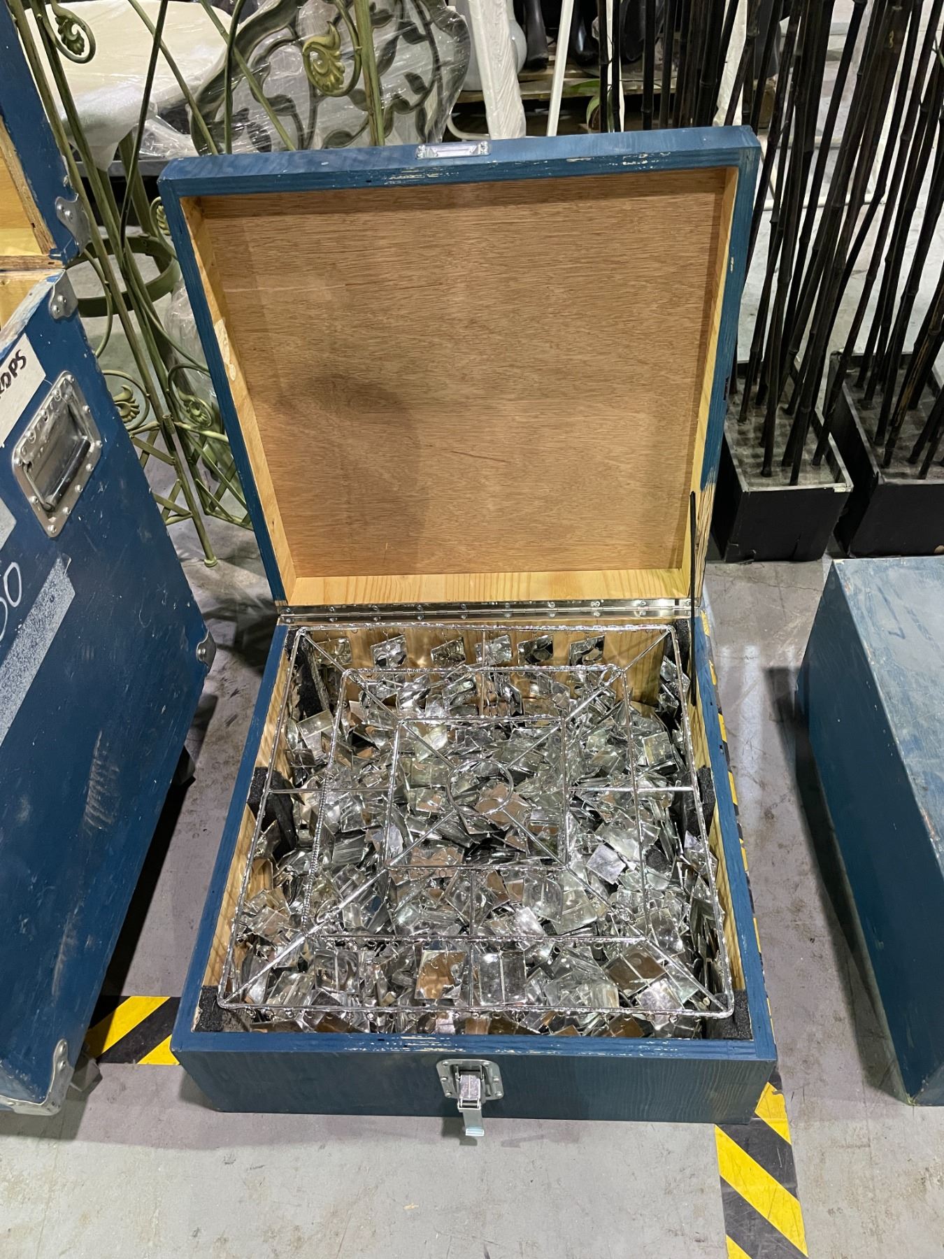 4 SMALL TRANSPORT CRATES WITH SQUARE GLASS EVENT CHANDELIERS *TRANSPORT CRATES INCLUDED*