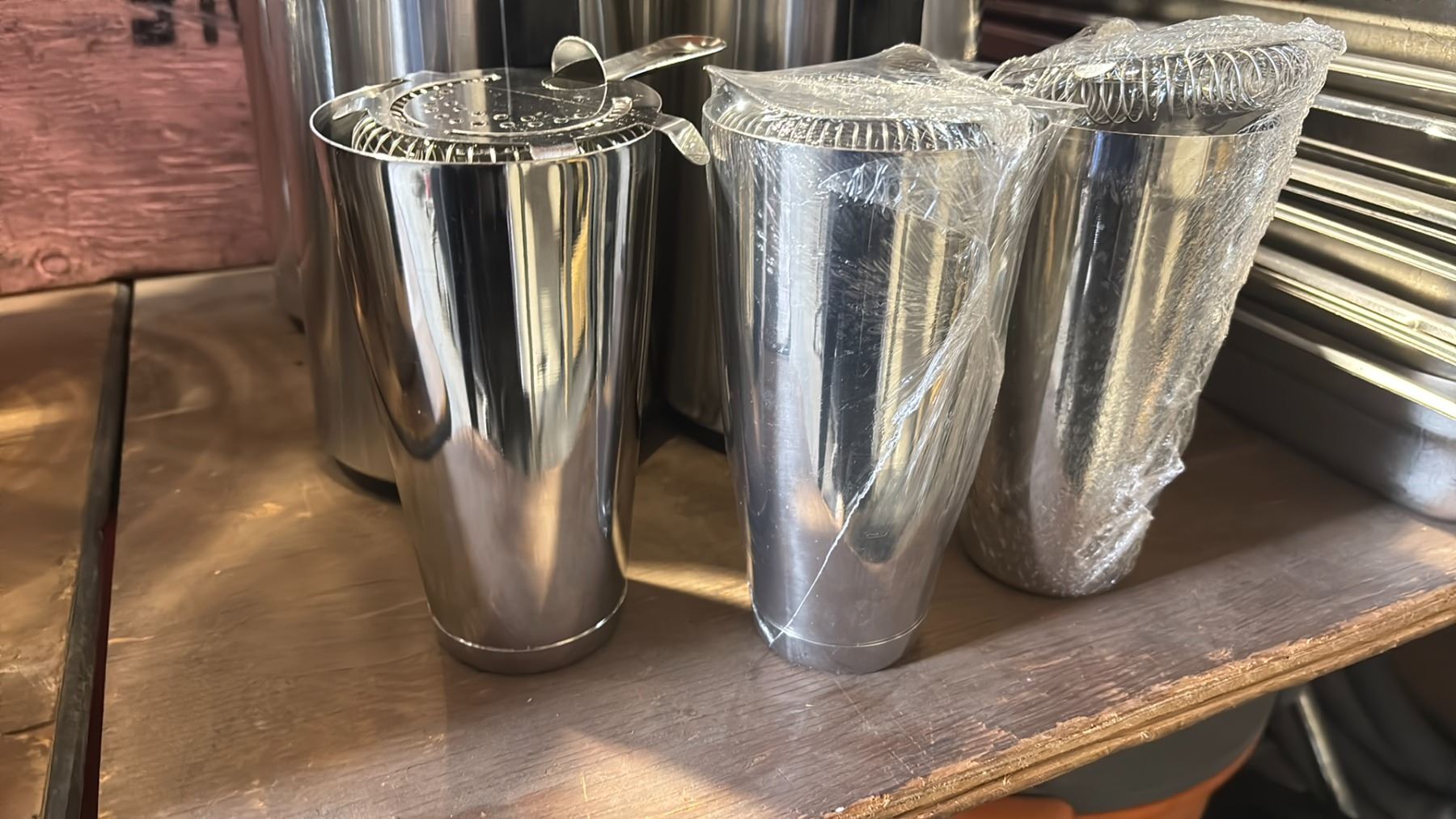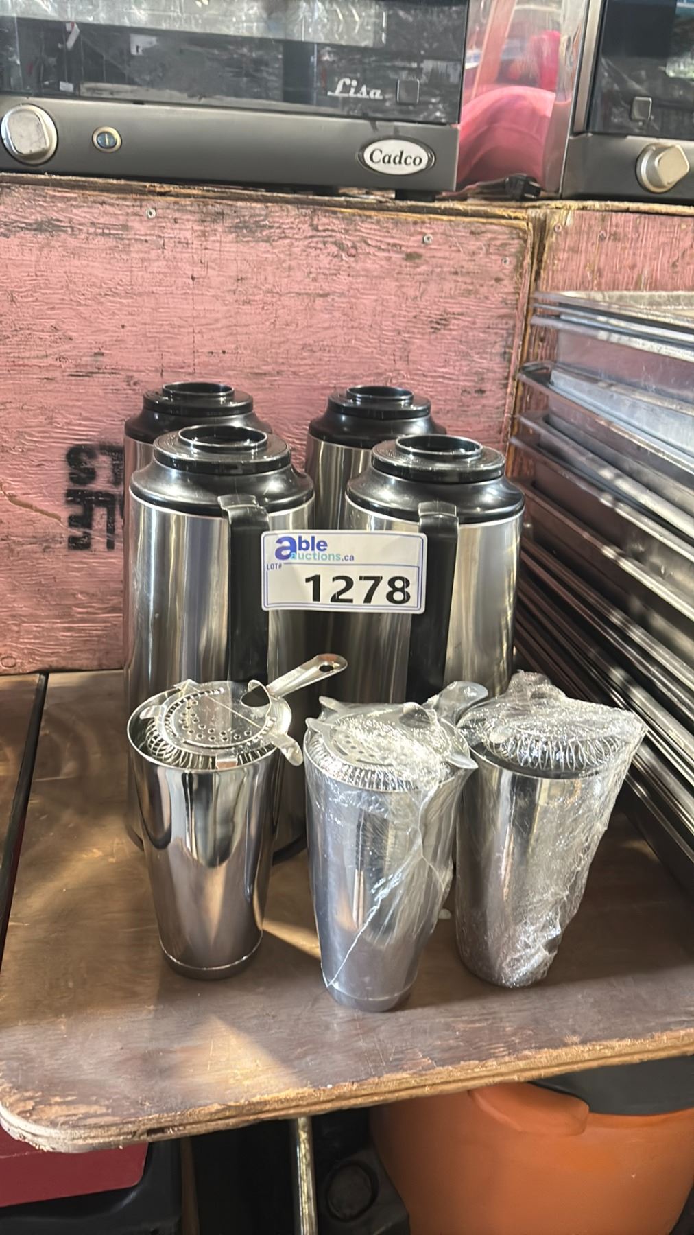 4 STAINLESS STEEL COMMERCIAL COFFEE CARAFES & 3 STAINLESS STEEL DRINK SHAKER/STRAINERS