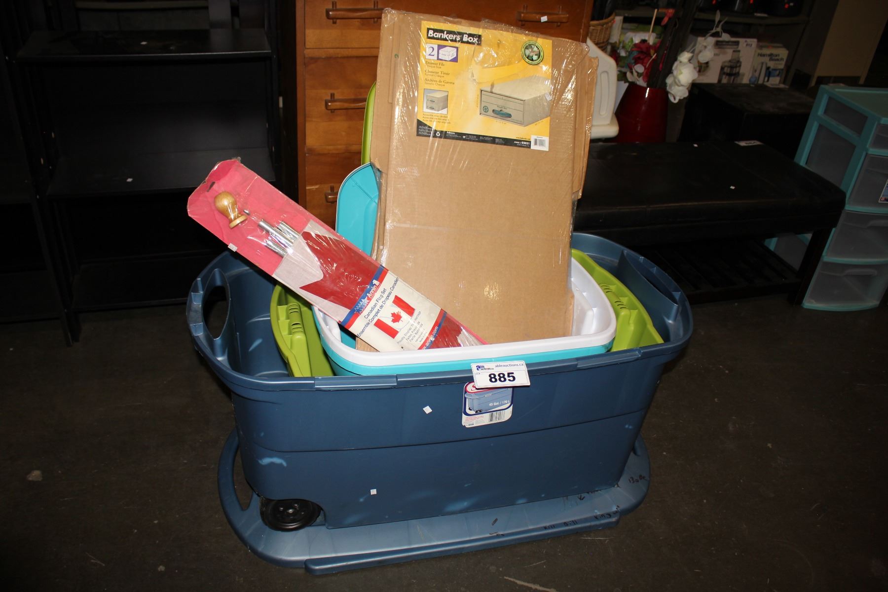 4 STORAGE TOTES, BANKERS BOXES, AND CANADIAN FLAG