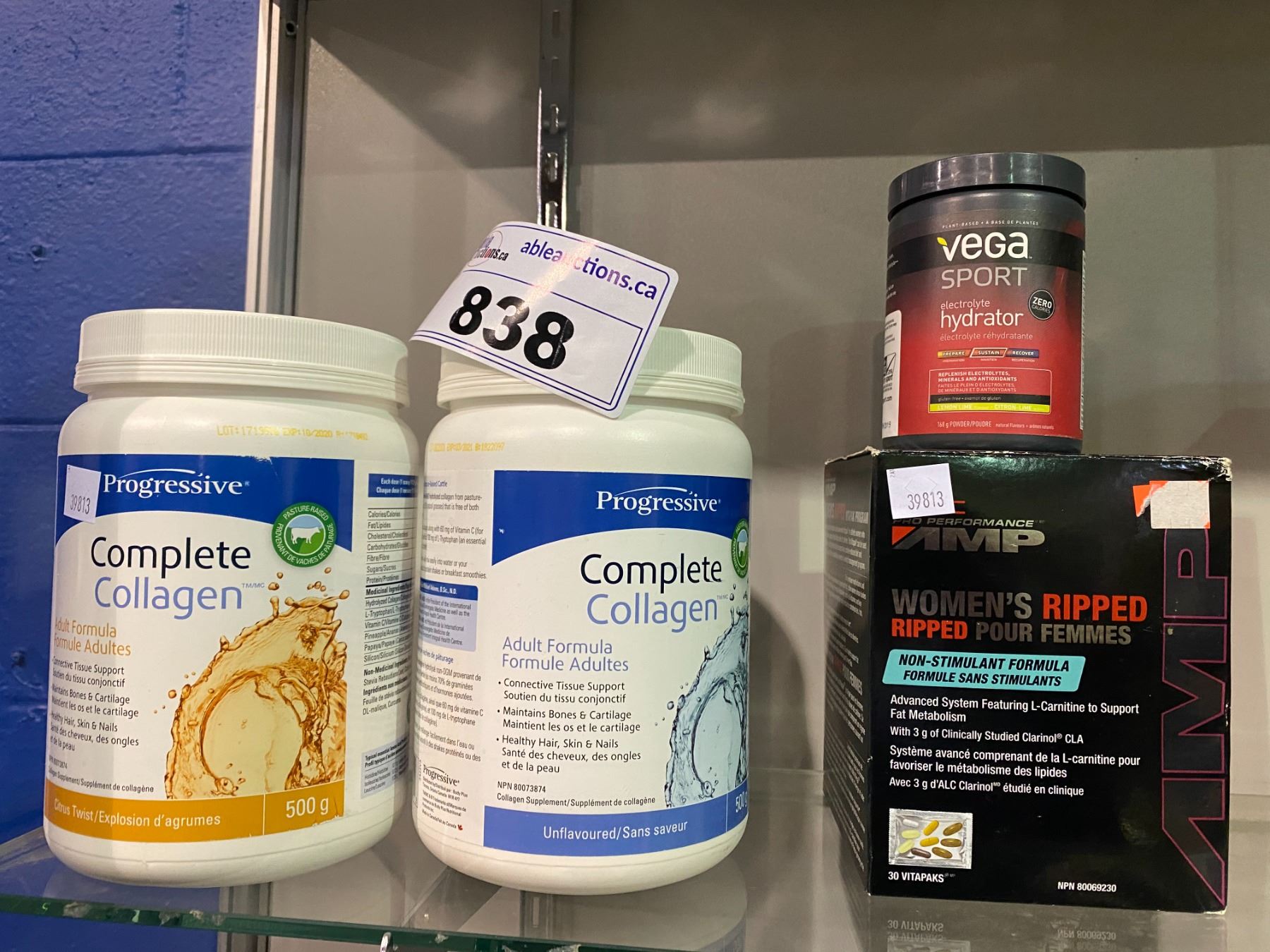 4 SUPPLEMENT PRODUCTS: 2 PROGRESSIVE COLLAGEN, 1 VEGA SPORT ELECTROLYTE HYDRATOR, & GNC AMP PERFORMANCE WOMEN'S RIPPED AMP