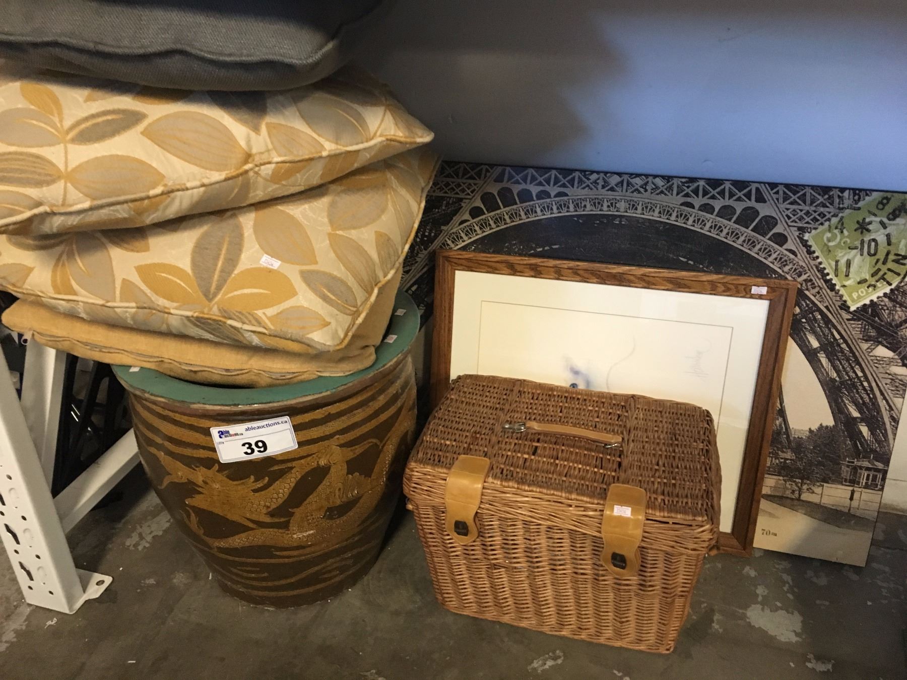 4 THROW PILLOWS/LARGE PLANTER POT/PICNIC BASKET/2 FRAMED PICTURES