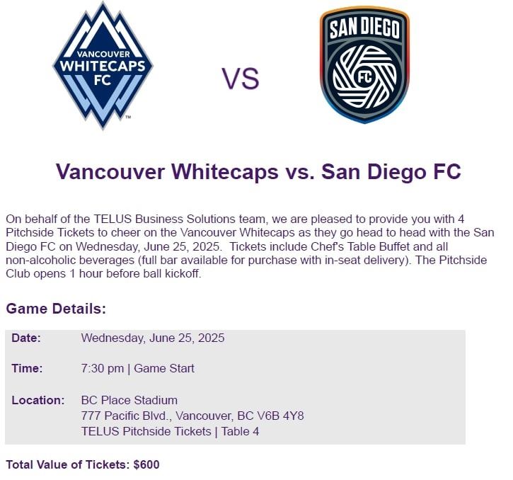 4 TICKETS TO VANCOUVER WHITECAPS VS SAN DIEGO FC - JUNE 25 4 PITCHSIDE TICKETS TO THE VANCOUVER WHITECAPS VS SAN DIEGO FC ON JUNE 25. TICKETS INCLUDE CHEF'S TABLE BUFFET AND NON-ALCOHOLIC BEVERAGES. $600.00 VALUE!