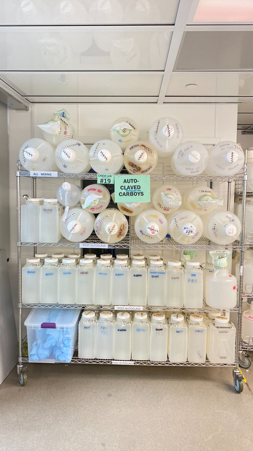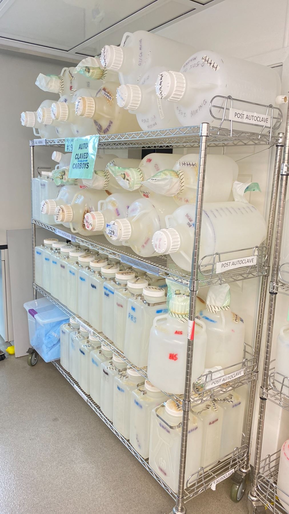 4 TIER MOBILE METRO RACK WITH ASSORTED CARBOYS