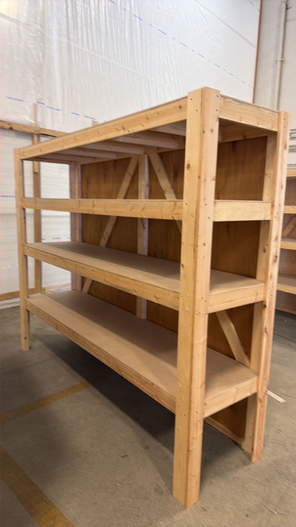 4-TIER WOOD SHELVING UNIT 79" H X 97.5" W X 25" DEEP
