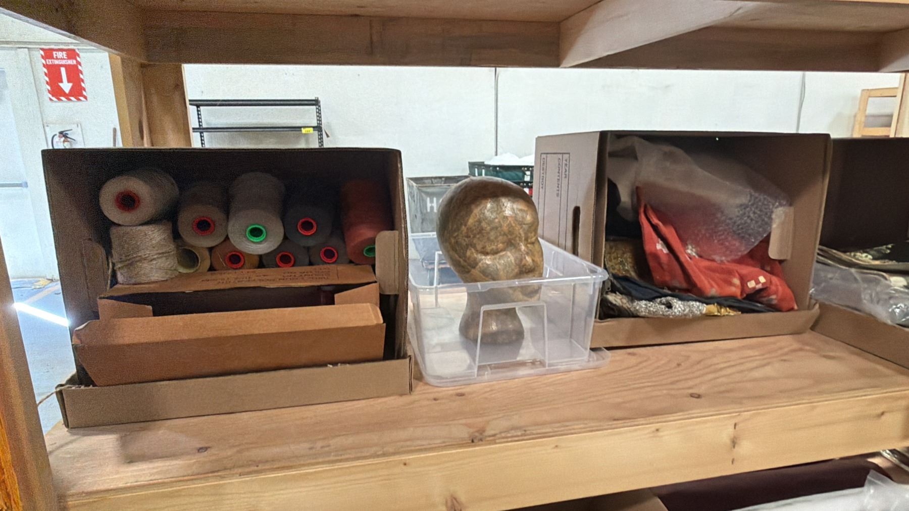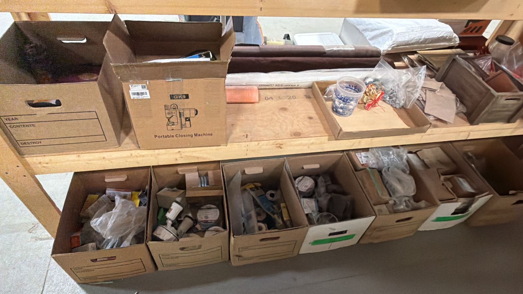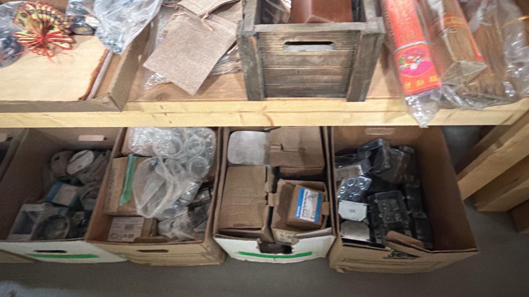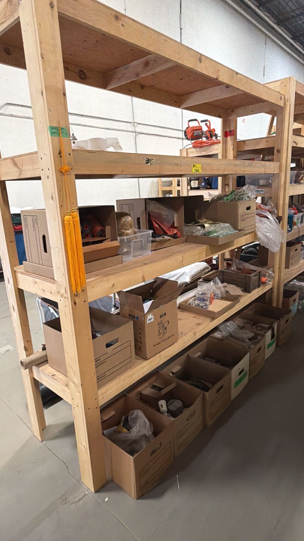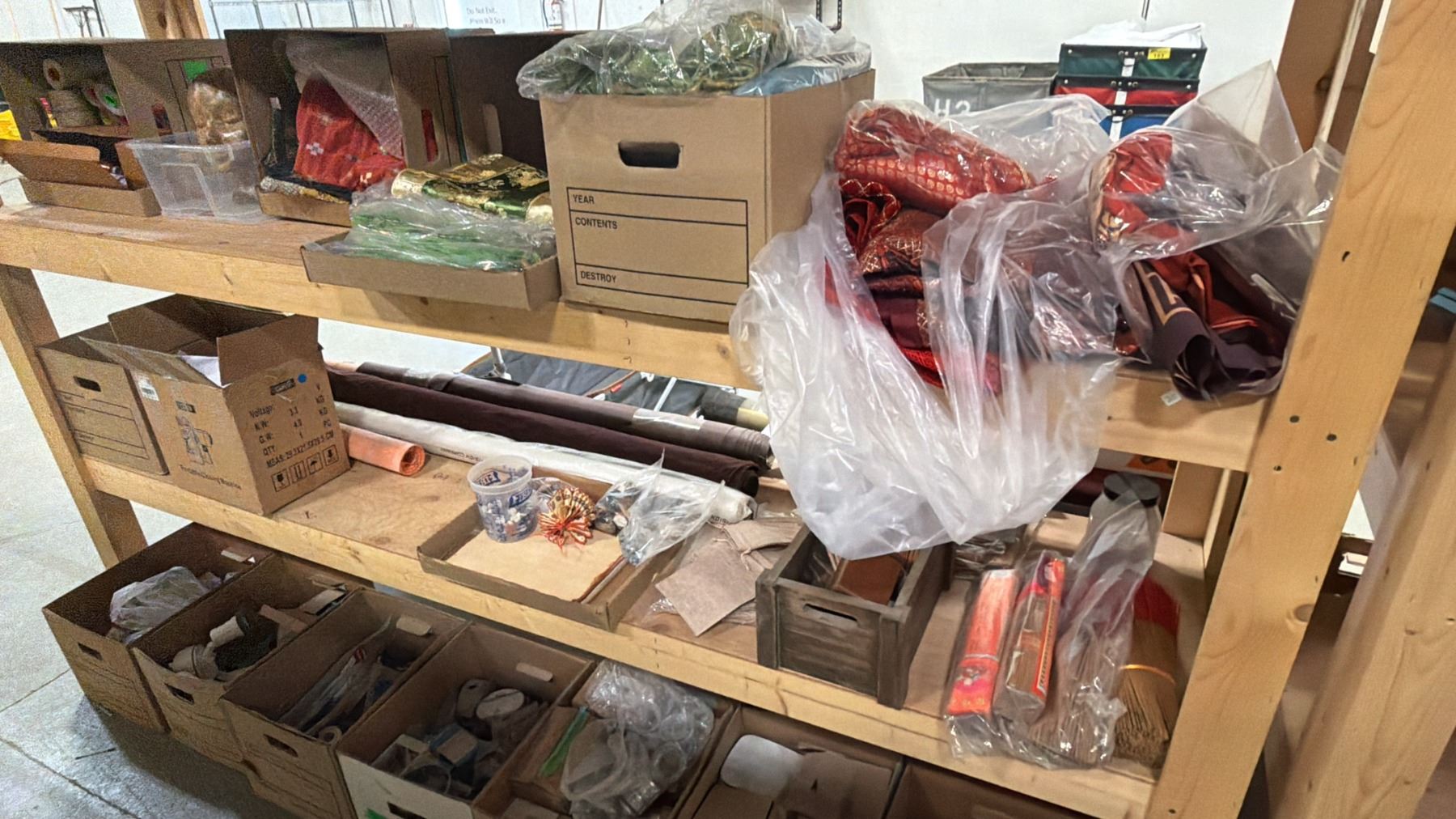 4-TIER WOOD SHELVING UNIT WITH ASSORTED SHOW PROP CONTENTS