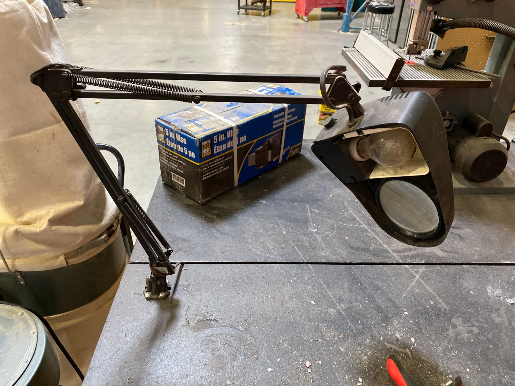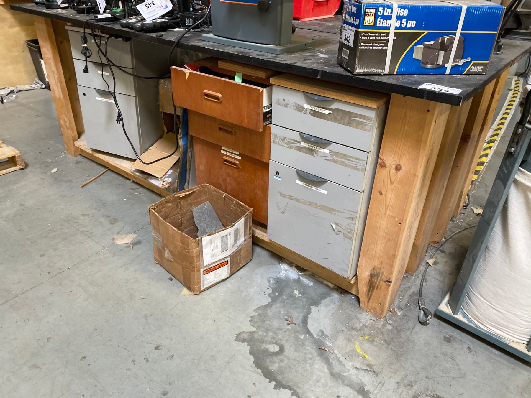 4' X 8' WORK BENCH WITH DRAWERS, 2 VICES AND MAGNIFYING GLASS