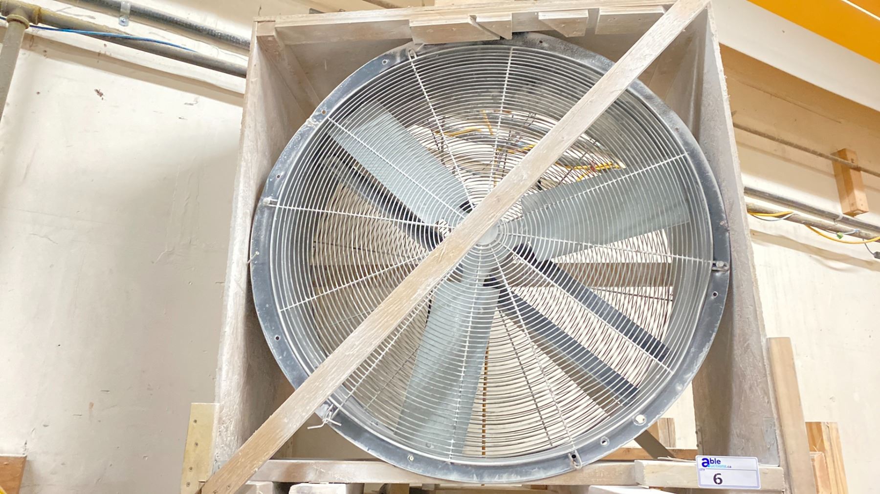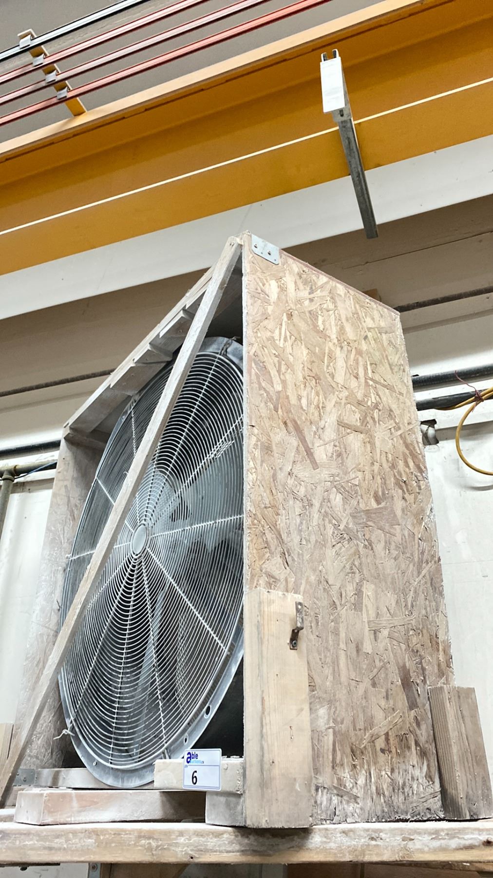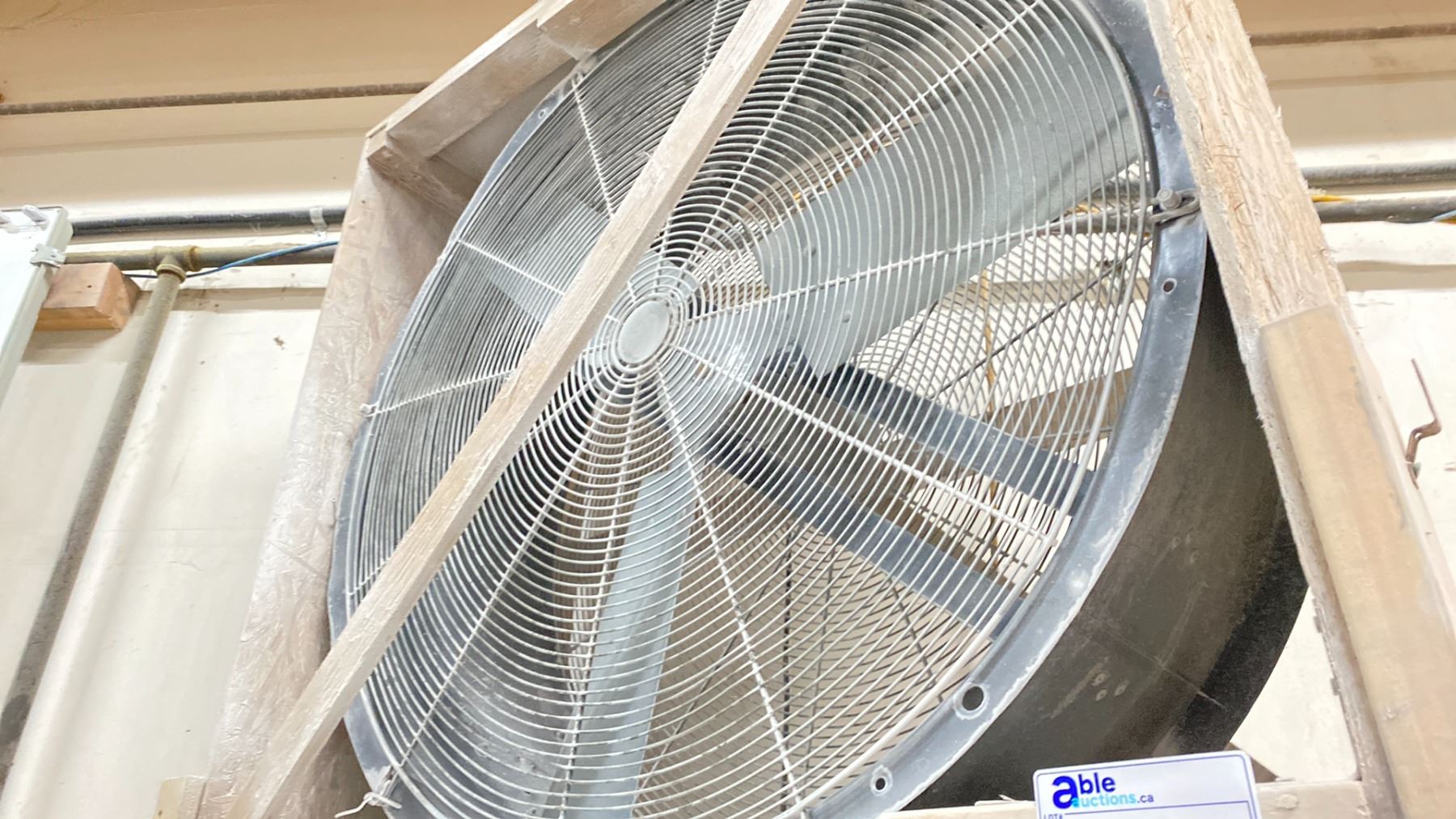40" DIAMETER BLACK ELECTRIC INDUSTRIAL AIR CIRCULATION FAN IN WOODEN SUPPORT BOX