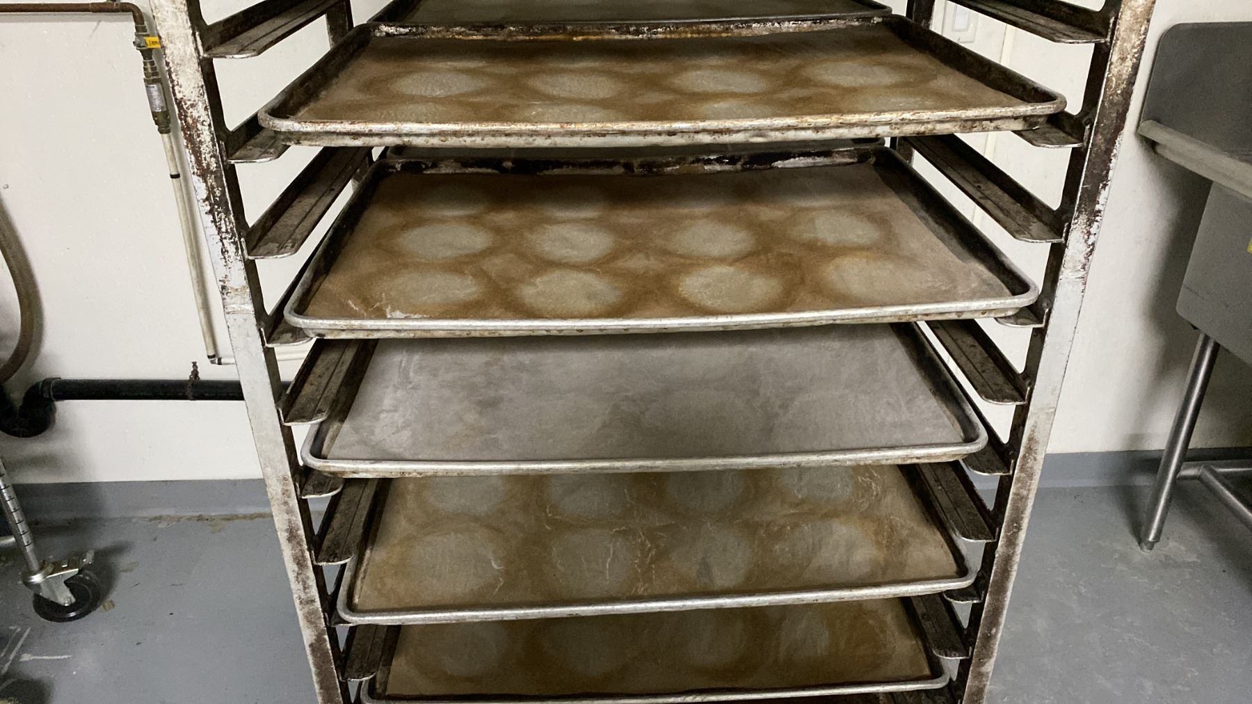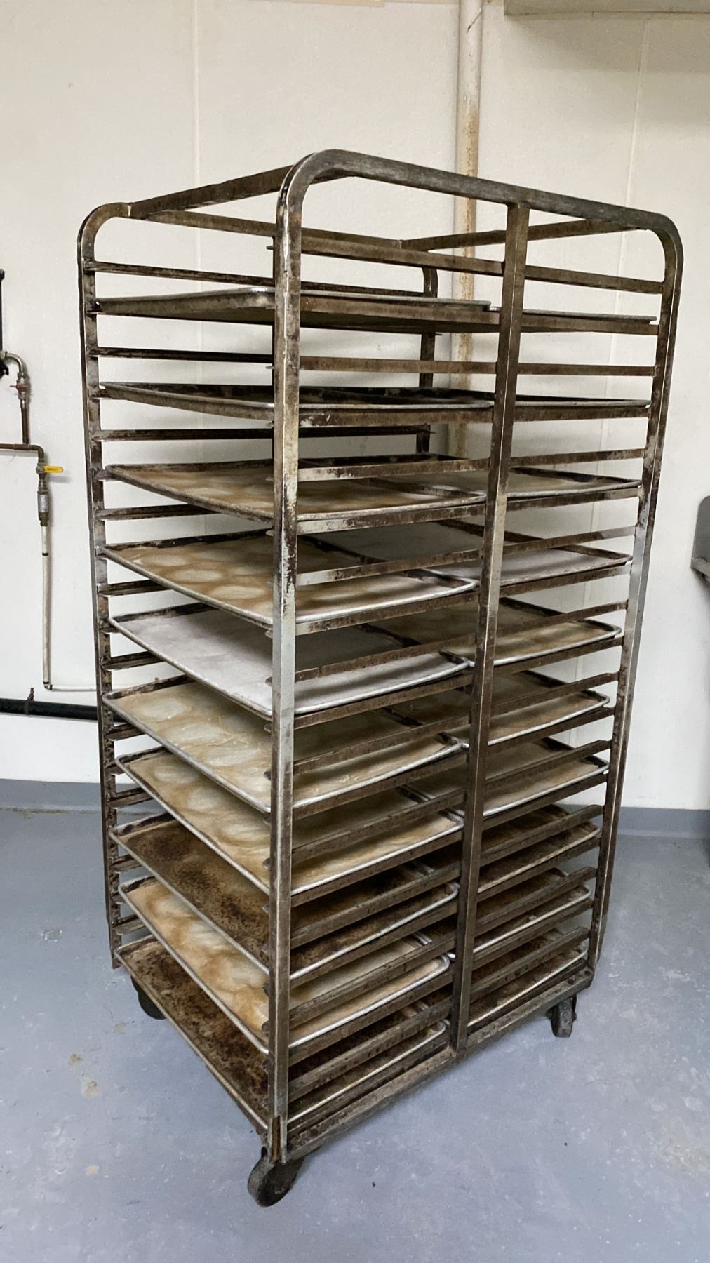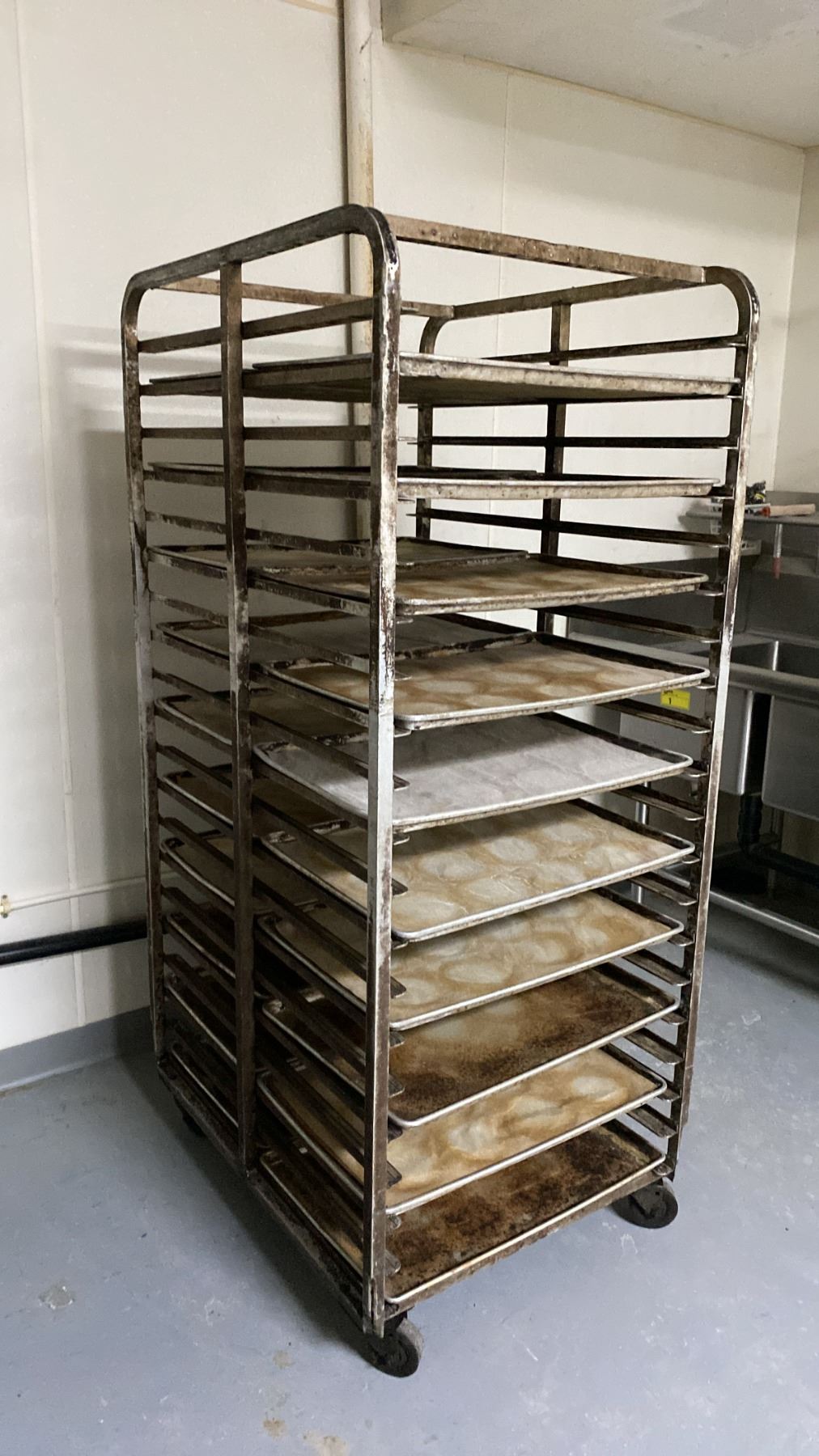 40 TRAY ALUMINUM MOBILE COMMERCIAL BAKERS RACK WITH 20 ALUMINUM COMMERCIAL BAKING TRAYS